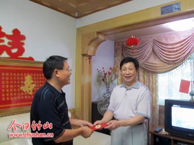 今日竹山网消息 中国共产党90岁生日来临之际,张振武小学开展了系列建党庆祝活动。6月21日下午,张振武小学校委会一行人员来到老一中校区看望慰问了退休老教师、老党员吴国德等同志,代表学校给他送去了慰问金和节日祝福。