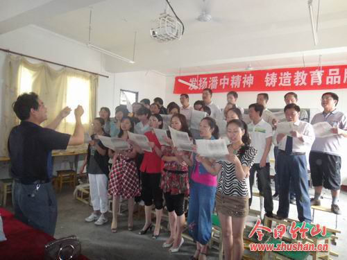 今日竹山网消息 为迎接建党90周年,潘口中学自6月以来要求各班学生每节课前唱红歌一曲,每个星期的音乐课都练习唱红歌,同时抽出一部分学生(七、八年级)和教师利用课外休息时间进行排练,准备作为党的生日礼物,在党的生日之时献给党。其中教师排练的两首红歌为《歌唱祖国》、《保卫黄河》,教师歌唱时所体现的豪情和对祖国的热爱之情不时引来学生的围观。(唐艳丽)