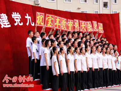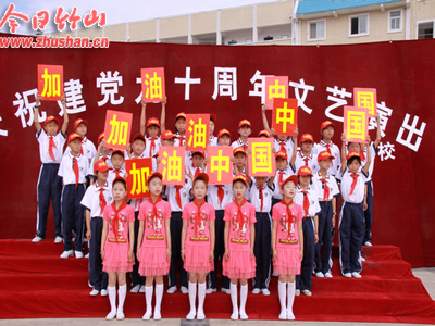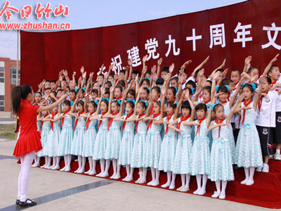 今日竹山网消息 6月1日上午,由宝丰镇中心学校主办、宝丰中学承办的的融观赏性、参与性、艺术性、趣味性于一体的庆祝建党90周年文艺演出活动隆重举行。本次活动有全镇中小学、幼儿园18个代表队参加,共有大合唱《歌唱祖国》、舞蹈《桃花朵朵开》、表演唱《八唱党的政策好》、快板《宝丰中学喜事多》等24个精彩节目上演。热情洋溢的节目充分展示了广大师生昂扬向上的精神风貌,是学校落实素质教育、艺术教育、生本教育的重要体现,丰富了校园文体活动,强化了同学们自我锻炼、自我升华的意识,增强了凝聚力和向心力,更表达了广大师生热爱党、赞美祖国、建设祖国的满腔豪情。图文精彩纷呈的文艺演出。 (朱本双)