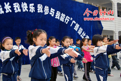 今日竹山网消息 4月29日上午,县实验小学全体师生满怀激情地迎来了“我成长,我快乐,我参与,我能行”暨第三套广播体操《七彩阳光》的比赛。随着广播体操音乐的节律,同学们一举手、一投足,动作标准,一侧身、一前屈,招招到位,展示了学生们热爱运动、朝气蓬勃、积极向上的精神风貌。这次广播操比赛是该校落实素质教育,推进阳光体育活动的一个重要体现,不仅丰富了校园文化生活,而且增强了学生的身体素质和自我锻炼的意识,展示学生热爱祖国、朝气蓬勃、积极向上的精神风貌,班级凝聚力得到进一步强化。(王斌 张生安 王平)