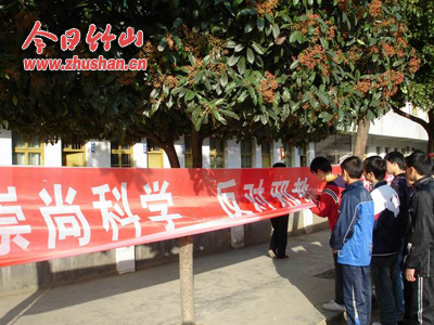 今日竹山网消息 11月8日上午,得胜中学900余名师生在操场上隆重举行了“崇尚科学,反对邪教”签名活动。(袁怀群)