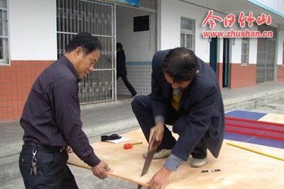 今日竹山网消息 “买木板,借锯条,找钢尺,修铺板。”11月2日,潘口中学的副校长曾先美和教师史俊忙得不亦乐乎,原来是学生睡的铺板坏了,他们便主动修理。近几年来,潘口中学为节省开支,对于损坏课桌凳、门窗等,倡导教师利用业余时间帮助修理。每年为学校节约维修费用数千元。(将诗军 唐艳丽)