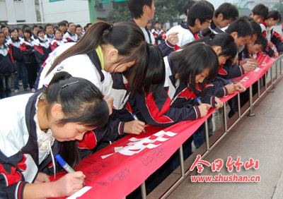 今日竹山网消息 为充分发挥学校在普及普通话和规范汉字中的基础作用,营造“说普通话,写规范字,做文明人”的良好的氛围,进一步提高全校师生的语言文字规范意识和推广普通话的参与意识。11月2日,竹山一中3000余名学生纷纷拿起签字笔,在“说普通话 写规范字 做文明人”大型条幅上签上了自己的名字,以实际行动为推广普通话,规范语言文字工作做出贡献。(党世根 李玲玲)