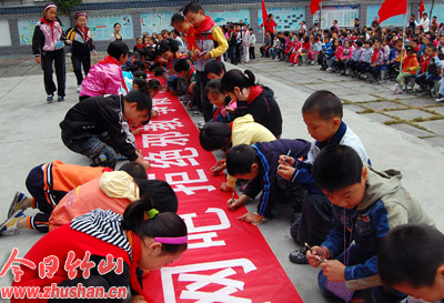 10月13日是中国少年先锋队诞辰日,活动中,该校号召全体同学崇尚科学、反对邪教,不参与迷信活动,不进网吧、游戏厅,努力争做“热爱祖国、理想远大,追求上进,品德优良、团结友爱,体魄强健、活泼开朗”的四好少年,千余名学生在一幅10米的长卷上郑重地写上了自己的名字,纷纷表示遵守承诺,远离网吧、拒绝邪教。(王斌 张生安 李绍平)