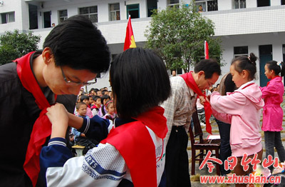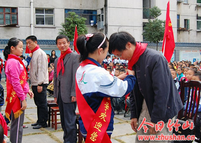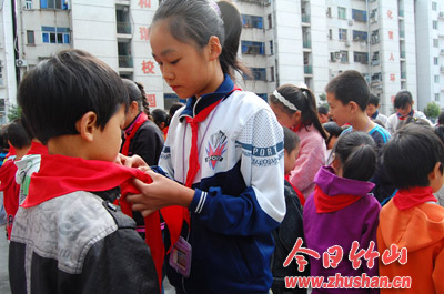 “我是中国少年先锋队队员。我庄严宣誓:时刻准备着:为共产主义事业,贡献一切力量!”10月11日上午,县实验举行了“远离网吧,争做四好少年”庆祝少先队建队61周年系列活动。近200名新队员面对少先队队旗庄严宣誓后,戴上了红领巾,成为少先队员。