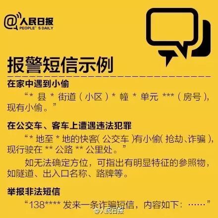夜里发现家里进了小偷、公车上遭遇抢劫或扒窃、被绑架或非法拘禁,怎么办?不是只有110,发短信到12110+区号后3位,说明地点和情形,不打电话也能报警!报警内容怎么写?应注意哪些细节?了解常识↓↓有备无患,转发扩散!