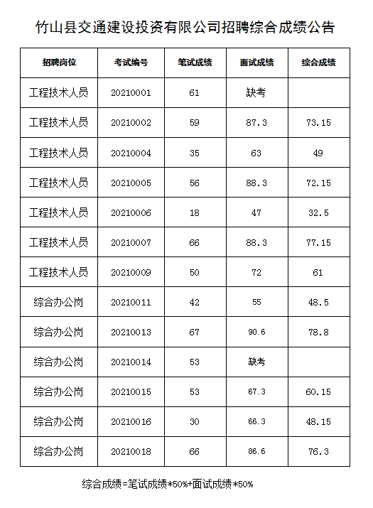 竹山县交通建设投资有限公司招聘综合成绩公告