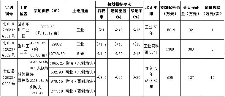 六、本次国有建设用地使用权的挂牌活动于2023年4月19日10时00分在竹山县公共资源交易中心(竹山县城关镇体育路20号)进行;三宗地块挂牌时间均为2023年4月9日09时00分至2023年4月19日10时00分。