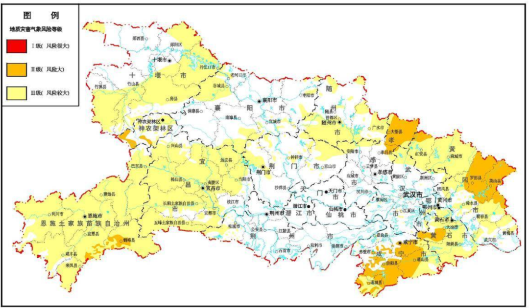 2023年6月18日20时—6月19日20时,预计三峡库区,神农架林区、宜昌地区、恩施地区、随州地区、鄂州市、黄石地区、咸宁地区、黄冈地区,十堰(十堰市东南部、郧西西部、郧阳东北部、丹江口、竹溪中部和南部、竹山中部和南部、房县)、襄阳(老河口西部、谷城、南漳南部、宜城、枣阳东部)、荆门(荆门市城区、钟祥、京山)、荆州(松滋)、孝感(安陆北部、孝昌东部)、武汉(黄陂北部、新洲东北部、蔡甸西部局部、江夏中部)以及其他强降水区域发生崩塌、滑坡、泥石流的风险较大;其中,神农架林区西南部,恩施(宣恩南部、鹤峰西南部)、孝感(大悟、孝昌东北部)、黄冈(红安北部、罗田、英山、浠水东北部、蕲春东北部)、武汉(黄陂西北部局部)、黄石(大冶西部和中部)、咸宁(咸安区、赤壁东部和南部、崇阳、通城、通山西部和中部)发生崩塌、滑坡、泥石流的风险大。