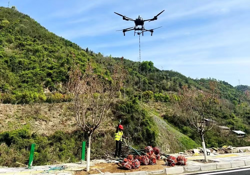 今日竹山网消息 4月8日,笔者在上庸镇圣水湖畔看到,无人机向陡峭的山体上运送树苗,工人们正在加快节奏植树种花扮靓“鲜花小镇”。一株株争先开放的野山樱成为242国道靓丽的风景线。