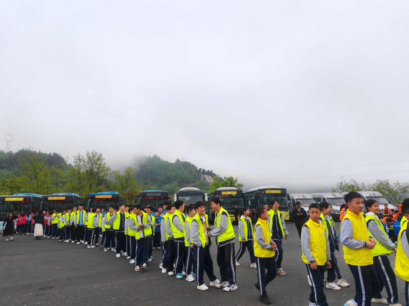 上午6点30分,亨运竹山公司调派了20余台大客车准时抵达学校,工作人员主动配合校方组织学生有序上车、行李装仓,并现场为师生们宣讲乘车安全须知,全力以赴做好运输保障工作。