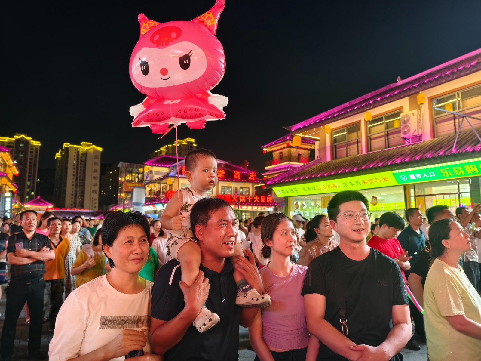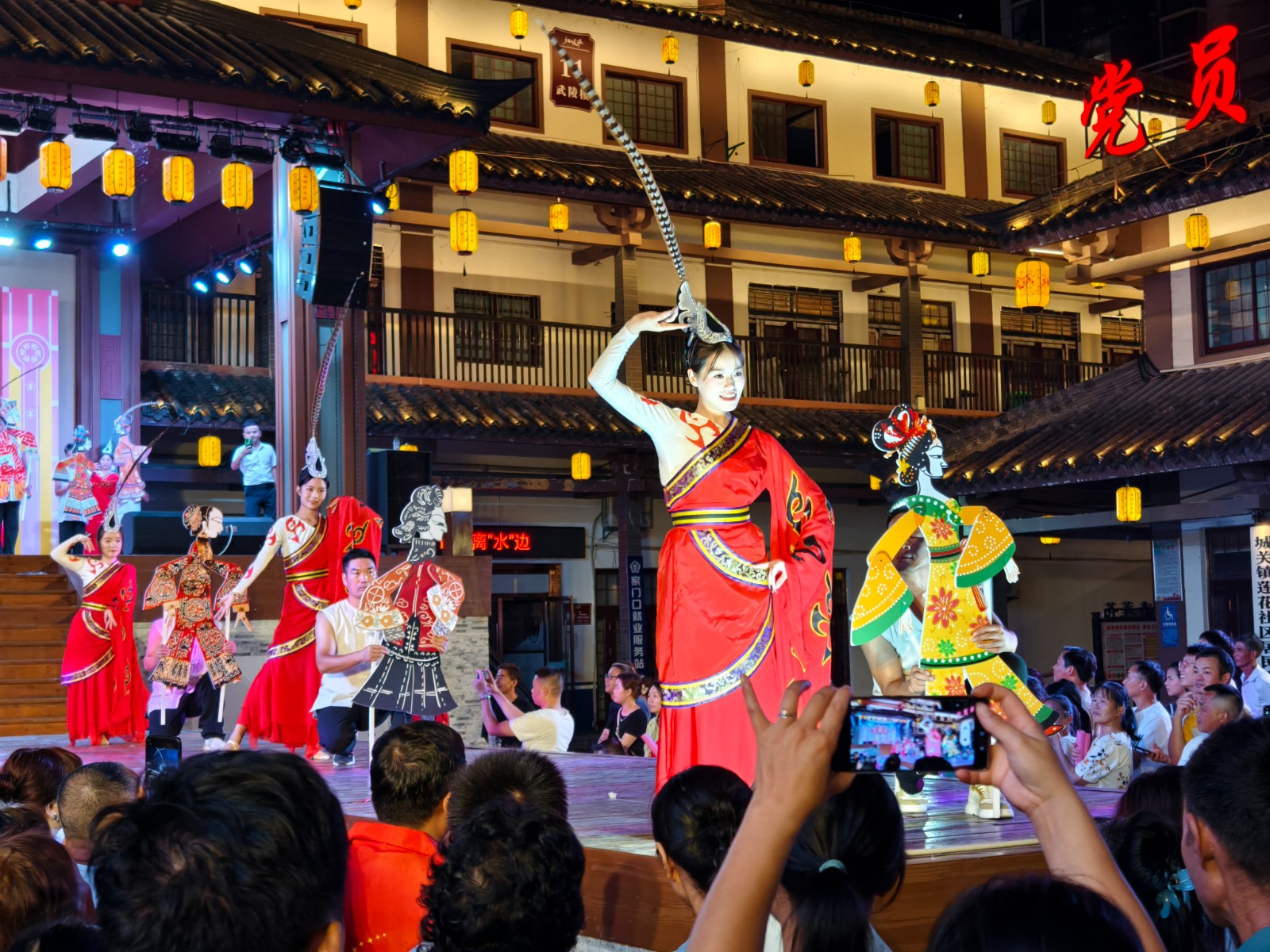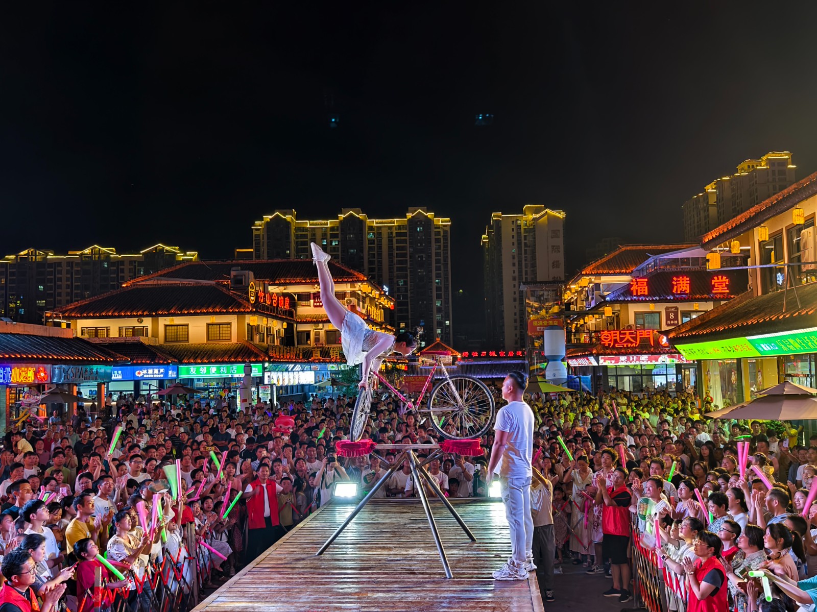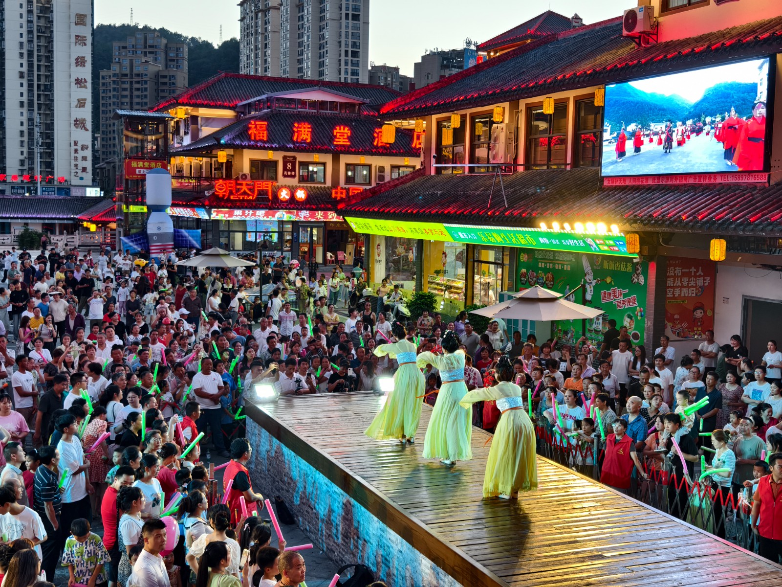 今日竹山网消息 8月12日晚,桃花源街区灯光璀璨,热闹非凡,在陶然广场深河乡的表演的舞蹈、渔鼓表演唱、杂技、快板舞、皮影非遗秀等精彩节目吸引近万人围观。(章伟 李玉升)