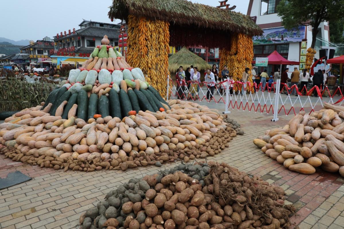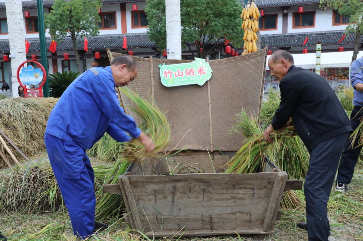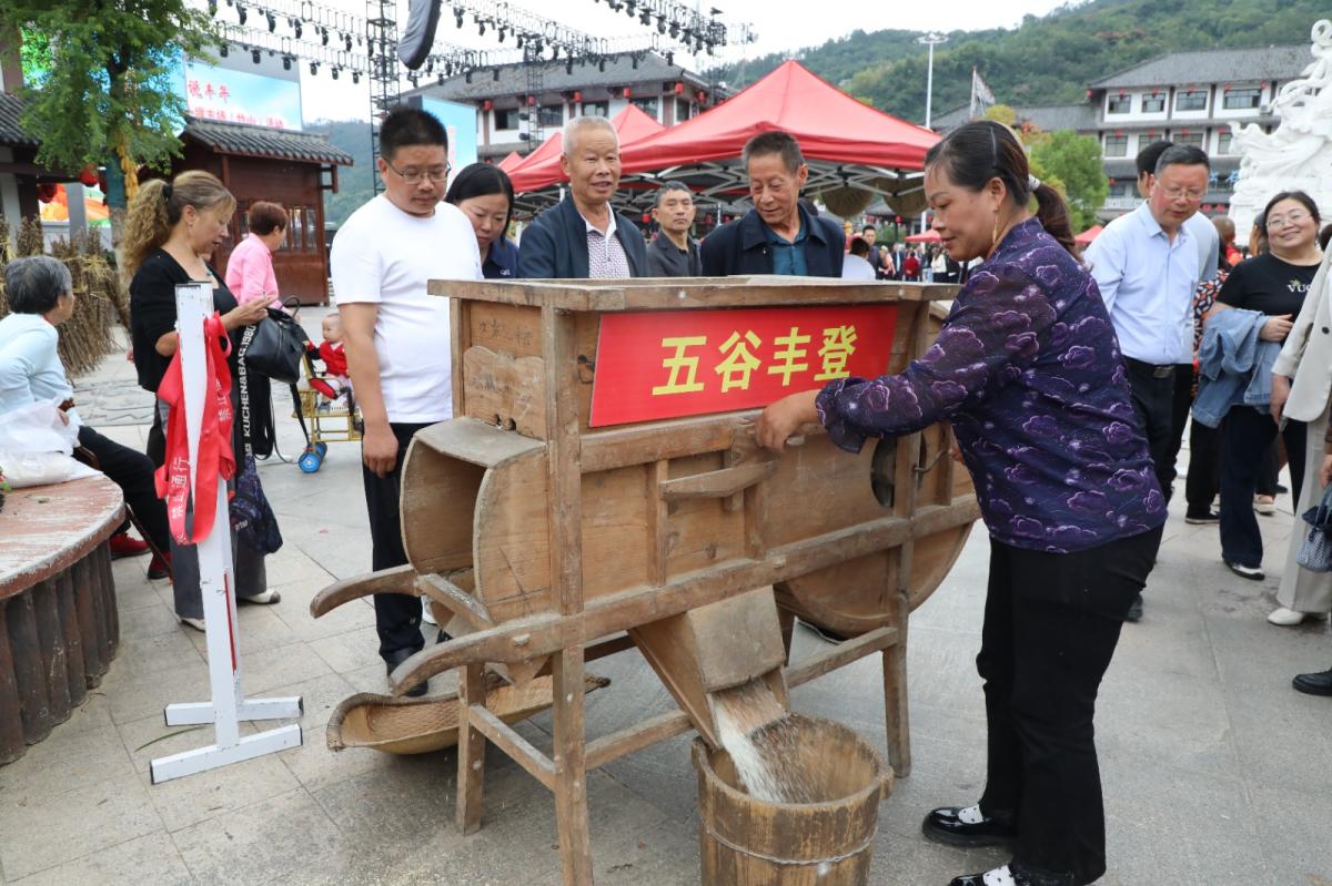 “晒秋”农产品及农具展示区是现场的一大亮点。玉米、辣椒挂满展区入口,南瓜、冬瓜、香葱分类摆放,五颜六色的农作物宛如一幅天然的调色盘。传统农事表演区,农民手持稻穗奋力击打谷桶,再通过鼓风机筛选,米粒纷飞的场景生动展示了大自然的馈赠和农耕技艺的传承。