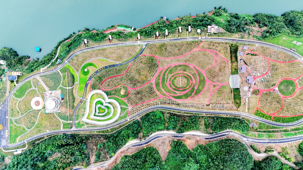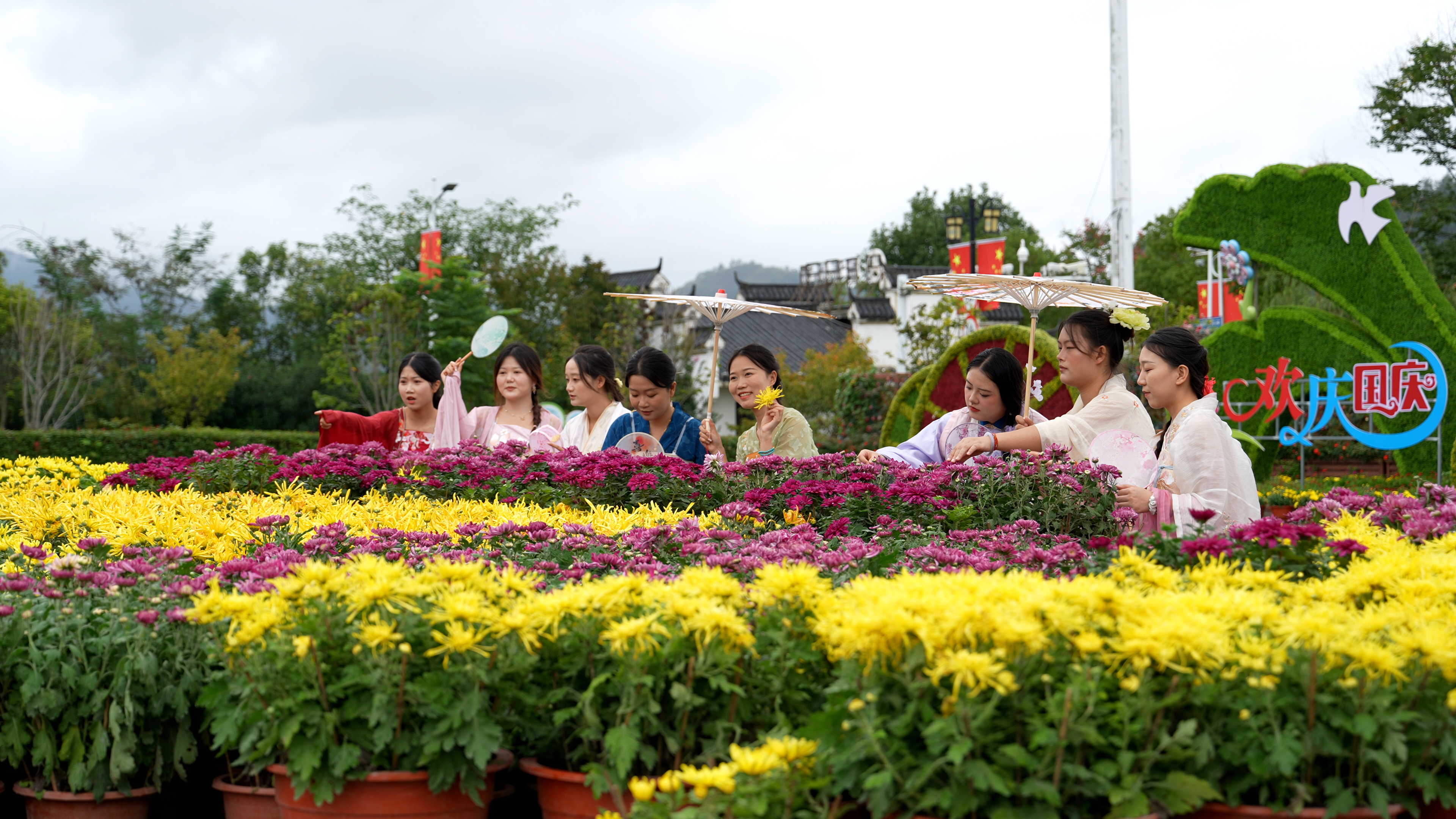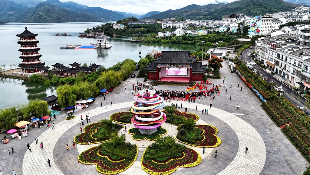四周飘扬的五星红旗,“上庸鲜花小镇”的标志性风车等景观,使得鲜花特色小镇分外喜庆和热闹。在十星广场,立体花卉景观周围被各色鲜花簇拥妆点,从空中俯瞰,犹如一个五彩缤纷的巨大花朵。广场入口处,绿植鲜花装扮的欢度国庆造型绚丽多彩,吸引了众多游客打卡拍照。轮番上演的川剧变脸、舞蹈《相思谣》、魔术表演《见证奇迹》及上庸滚龙、划旱船等传统民俗表演吸引众多游客围观欣赏。