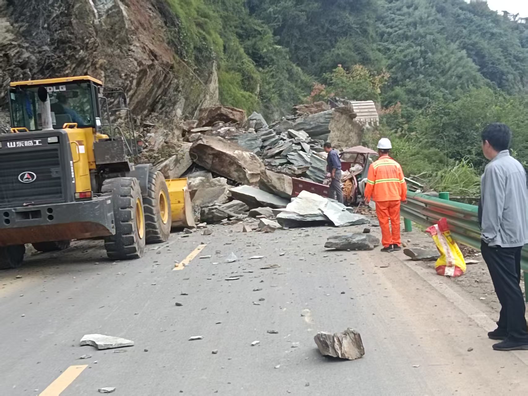 10月7日下午,该路段突发大规模塌方,大量石块倾泻而下,导致路面、路基及堤岸严重受损,交通瞬间中断。险情就是命令!县公路养护中心第一时间组织力量赶赴现场,迅速抢通应急通道,并规范设置警示标志,全力恢复交通,提醒往来车辆注意安全。