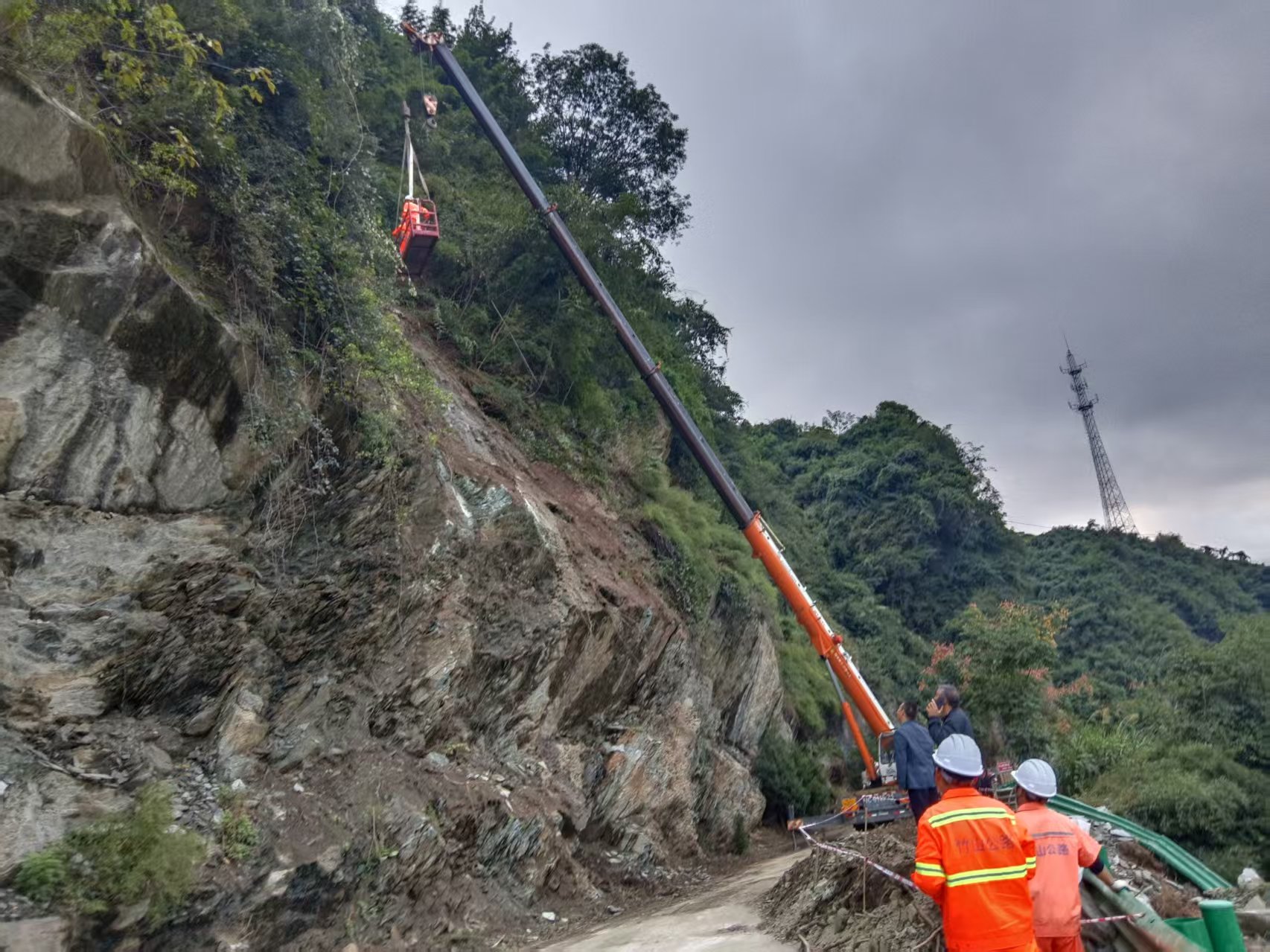 施工现场,工人们在严格的安全交底后,借助悬臂车升至峭壁,化身“空中飞人”。他们仔细勘察,用专业工具精准清除那些在昨日塌方中震松、却尚未坠落的危岩。每一次撬动,都消除了一个安全隐患;每一块碎石落下,都意味着通行多一分保障。