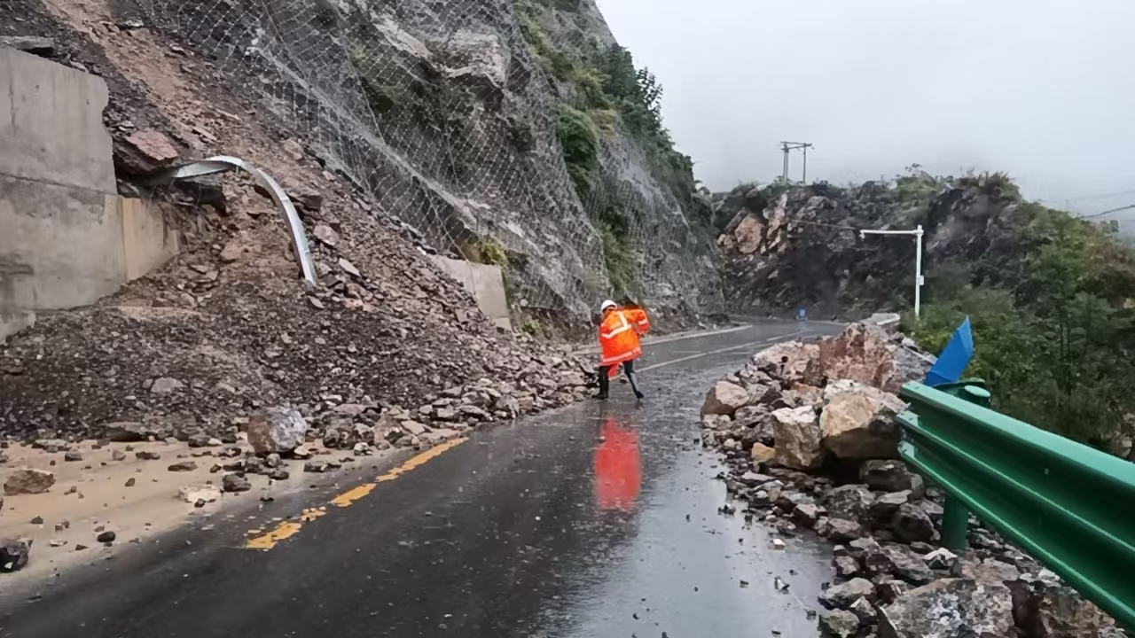 9月29日晚上,242国道七里扁发生大规模山体崩塌,整片山体瞬间倾覆于路面,路基、钢护栏等设施严重损毁,交通彻底中断。县公路养护中心接报后火速响应,连夜组织人员勘察险情、疏导交通、安抚滞留司乘。鉴于山体极不稳定,极易发生二次灾害,且夜间持续强降雨,现场研判后果断决定次日清晨开展机械抢通,并立即设置警示标志,实施交通管制,彻夜值守,中心24小时值班,第一时间告知来访司乘人员相关信息。次日黎明,2台挖掘机、4辆运输车及1台铲车迅速投入作业,养护人员现场指挥,有序推进清障工作。便道打通后,采取间歇式放行策略,兼顾通行效率与施工安全。历经24小时连续奋战,至9月30日晚10时,塌方体被彻底清除的那一刻,所有人都松了口气。