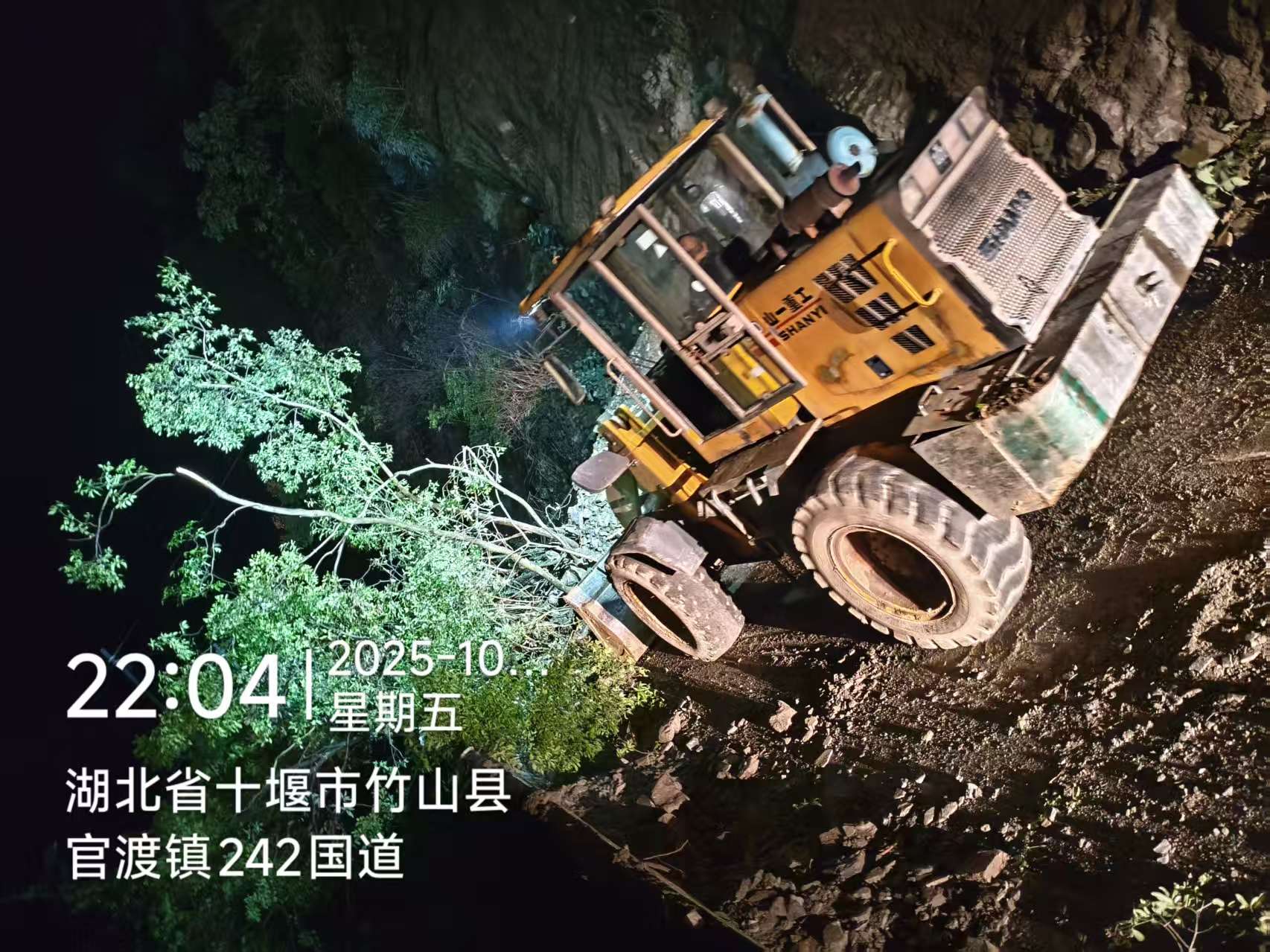 10月3日晚8时40分,夜色深沉,242国道K1807+000松树岭路段发生塌方,约1000立方米泥石流瞬间掩埋道路。官渡公路养护站人员顶风冒雨奔赴现场,立即封锁危险区域、设置警示标志、疏导车辆、安抚司乘,同步调度机械清障。夜色中,橙色的反光服熠熠生辉,汗水与雨水交织,抢通战役紧张有序。不到两小时,当晚10时30分,便道抢通,滞留车辆安全通过。