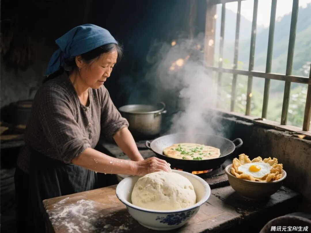 六点半进厨房,瓷砖地上已经泛着热气。昨晚发的面团在瓷盆里膨得老高,按下去软软地回弹。加勺碱面揉开,葱花碎掉进面团里,辛香混着酵母的微酸漫出来,这是妈妈教的发面诀窍。鏊子烧得发烫,饼坯放上去“滋啦”响,边缘渐渐鼓起金黄的边。鸡蛋在热油里炸开花,丝瓜切滚刀块扔进汤锅,白瓷碗盛起时,热气模糊了窗外的霍山尖。汗珠子顺着额角往下掉,砸进面糊里,烙出的饼反倒带着点咸香,吃着格外够味。