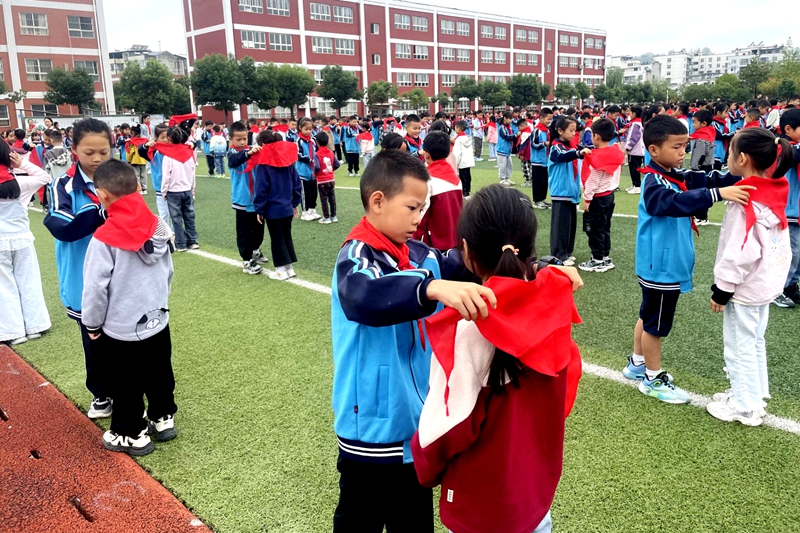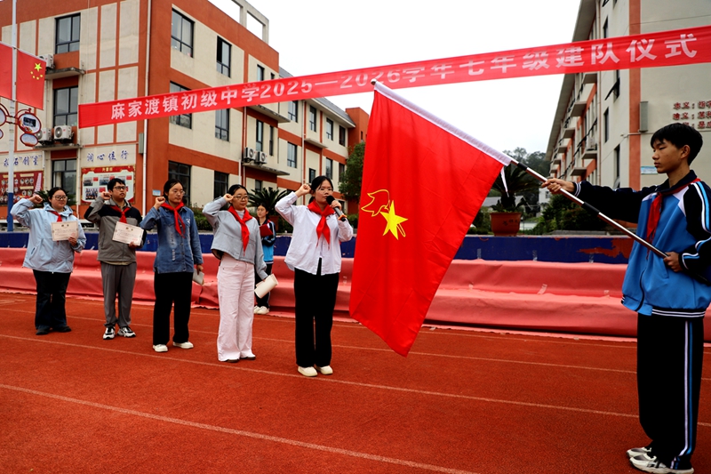 活动中,麻家渡镇小学在辅导员和老师们的共同见证下,二年级158名同学经过严格考核,光荣地加入中国少年先锋队。高年级的老队员们亲手为新队员佩戴上鲜艳的红领巾,并带领他们庄严宣誓。(刘东 张世奇)
