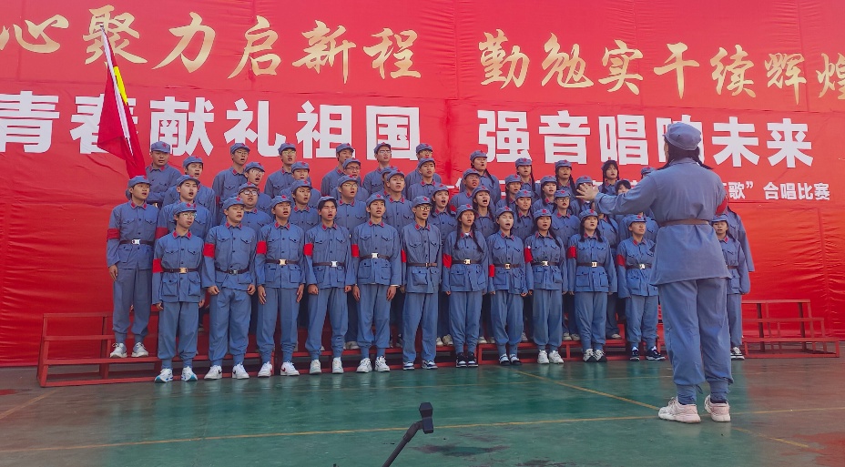 学生们通过沉浸式演出,将红军长征中的传奇战役搬上舞台,为师生呈现了一堂生动深刻的革命传统教育课。舞台上,十几名学子身着红军军装,臂佩红色袖套,头戴缀着红五星的八角帽,在飘扬的党旗映衬下,重现了1935年中央红军在赤水河畔迂回穿梭、出奇制胜的经典战例。学生们用舞蹈展现红军跋山涉水的艰辛,用声情并茂的朗诵再现毛泽东同志运筹帷幄的智慧,合唱《四渡赤水出奇兵》将全场气氛推向高潮。舞台上,“红军战士”们时而奋勇前进模拟战场突击,时而手挽手演绎军民鱼水情深,其情其景令在场观众无不动容。