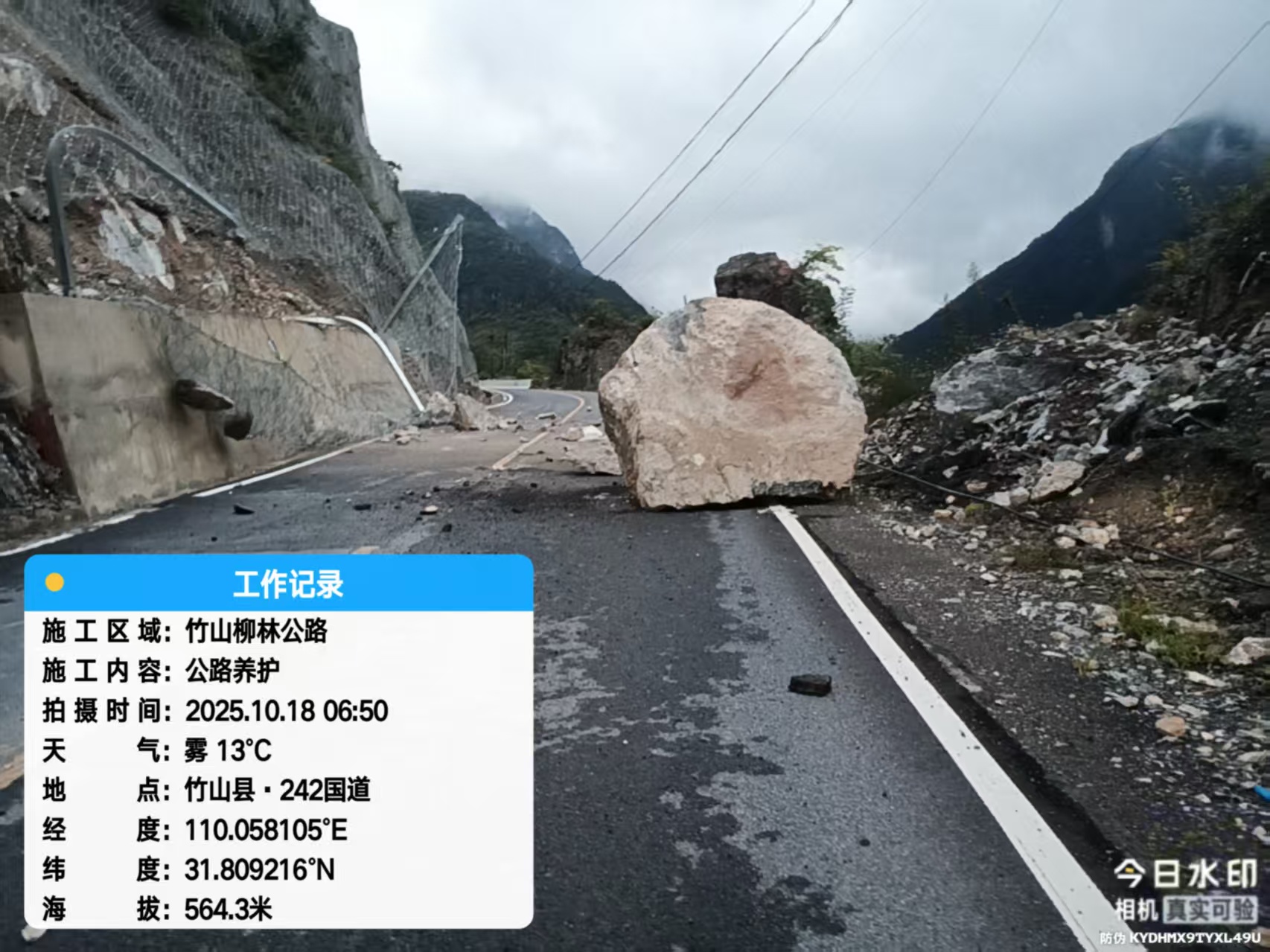 今日竹山网消息 10月17日晚7时30分,一场突如其来的险情打破了山区的宁静。县公路养护中心柳林养护站在例行巡查中发现,G242国道K1827+900与K1826+350两处路段同时发生山体塌方,落石与土方完全阻断了竹山县城至柳林方向的交通。