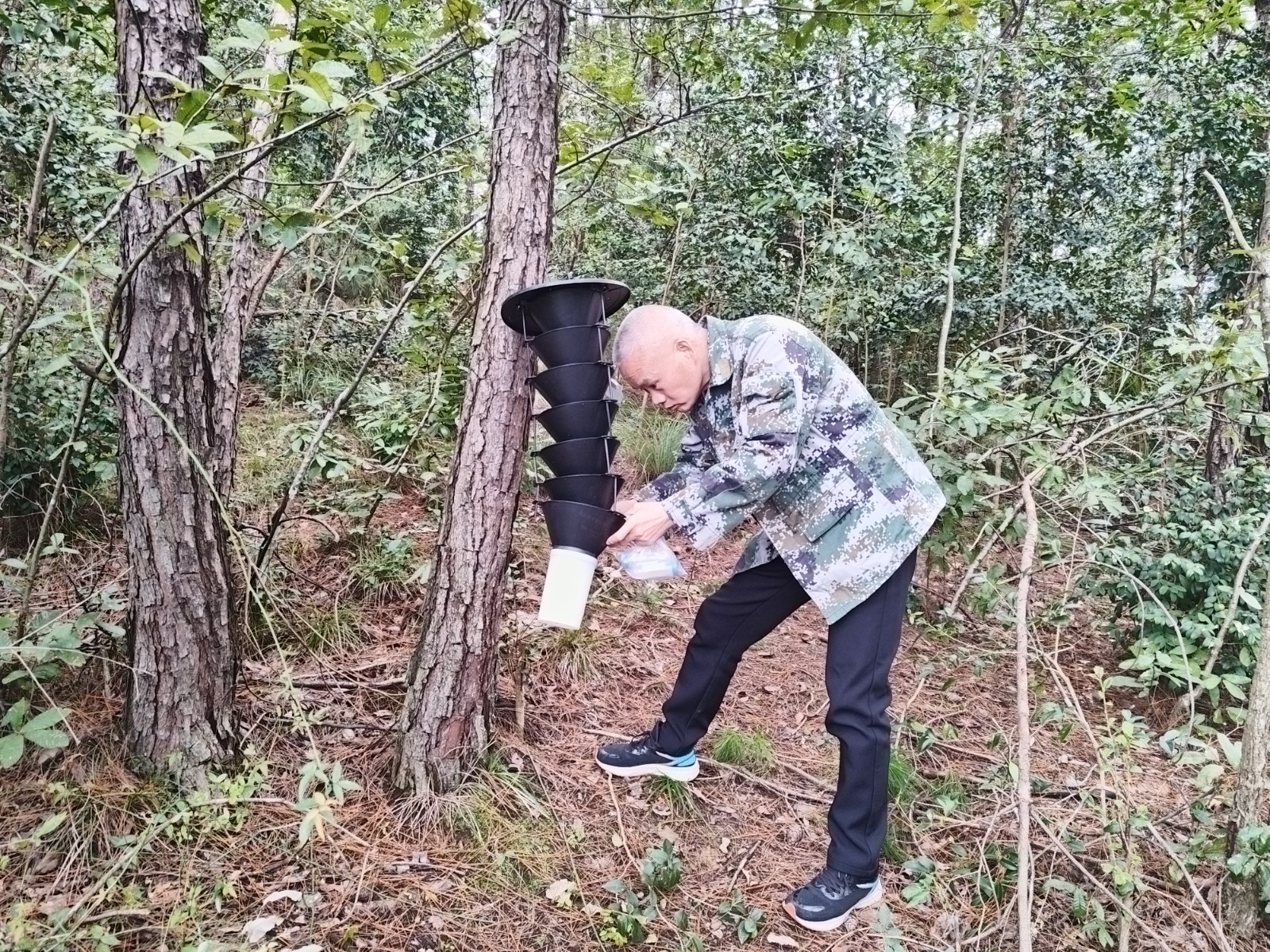今日竹山网消息 10月23日,深河乡林业工作人员在松林间检查害虫收集装置运行情况,对松树钻蛀类害虫进行精准监测与收集。