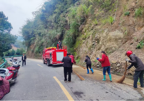 今日竹山网消息 10月23日,深河乡双湾村公路旁,志愿者们在消防车的配合下,对路面开展集中清理,清除淤泥、碎石,疏通排水沟渠。