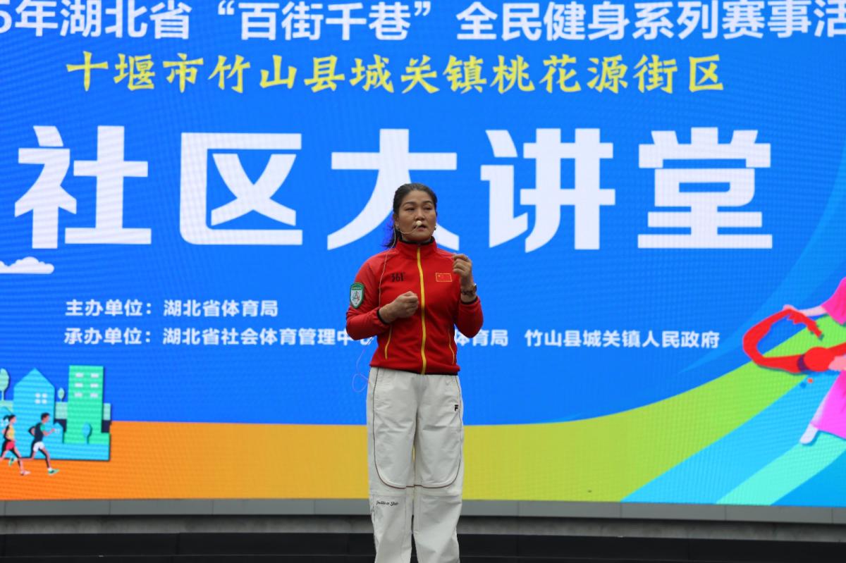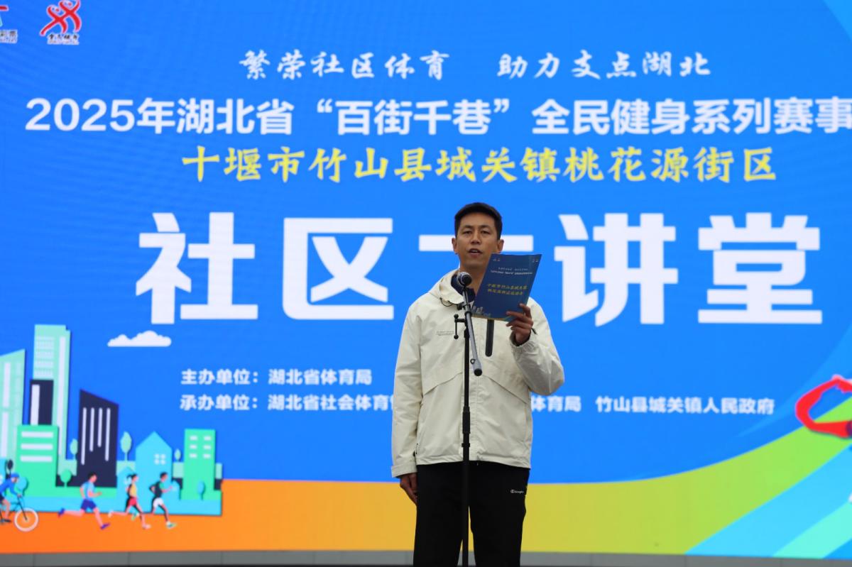 今日竹山网消息 10月24日,2025年湖北省“百街千巷”全民健身系列赛事活动竹山站之“社区大讲堂”在桃花源街区女娲广场开展。