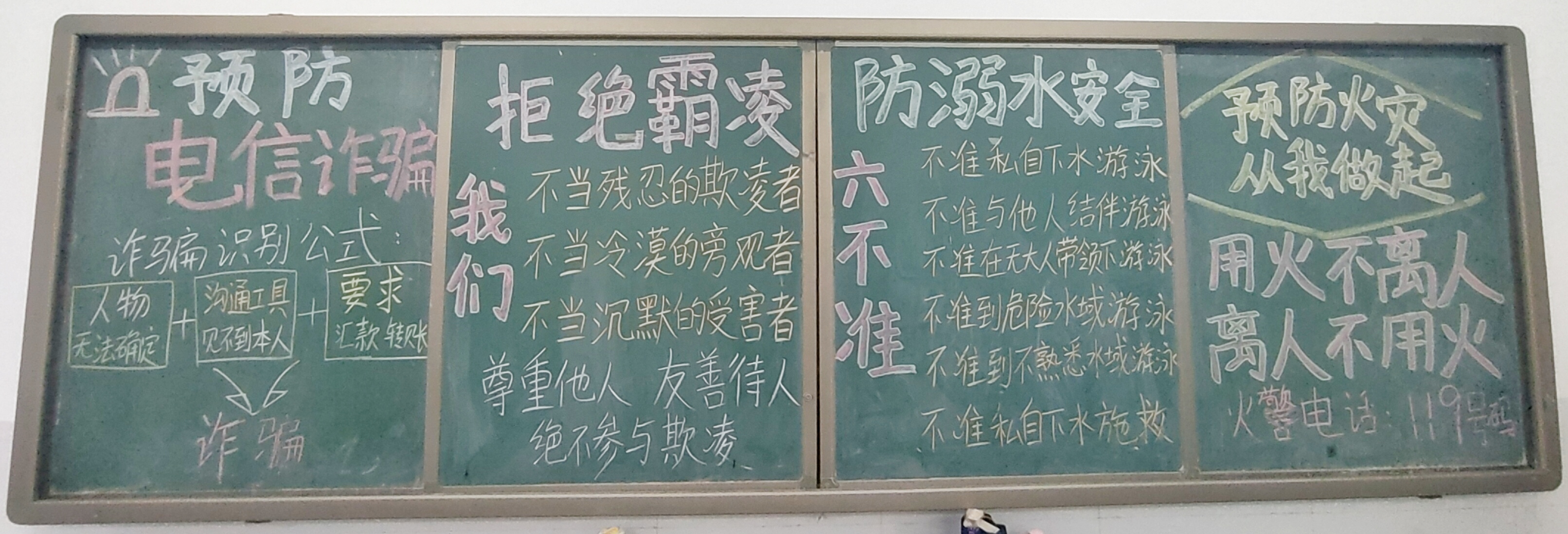 学校还精心打造安全教育板报,分别从预防电信诈骗、拒绝霸凌、防溺水“六不准”、预防火灾等方面,以清晰的条理、醒目的提示,将安全知识直观呈现,成为校园里一道兼具知识性与警示性的风景线,时刻提醒学生关注安全细节。