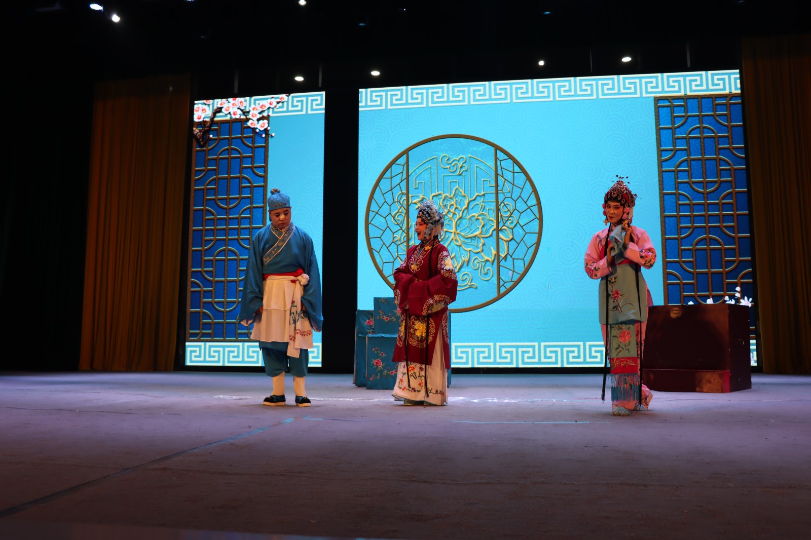 舞台上,专业演员身着绣工精巧的传统戏服,以竹山高腔特有的高亢唱腔、细腻腔韵,将《柜中缘》的故事演绎得活灵活现。少女刘玉莲的聪慧果敢、母亲的朴实诙谐、哥哥的憨直可爱,在演员们字正腔圆的唱念与灵动传神的身段中跃然台上;救助岳雷时的紧张氛围、家庭互动中的生活趣味,通过高腔独特的旋律节奏层层递进。演员们眼波流转藏戏韵,惟妙惟肖的表演,让剧中人的喜怒哀乐化作股股暖流,淌进每一位观者心底。台下的学子们眼神发亮,时而为诙谐桥段捧腹轻笑,时而为婉转唱腔轻声跟和,掌声与欢呼伴着余韵起落,满是青春的活力与喜悦。