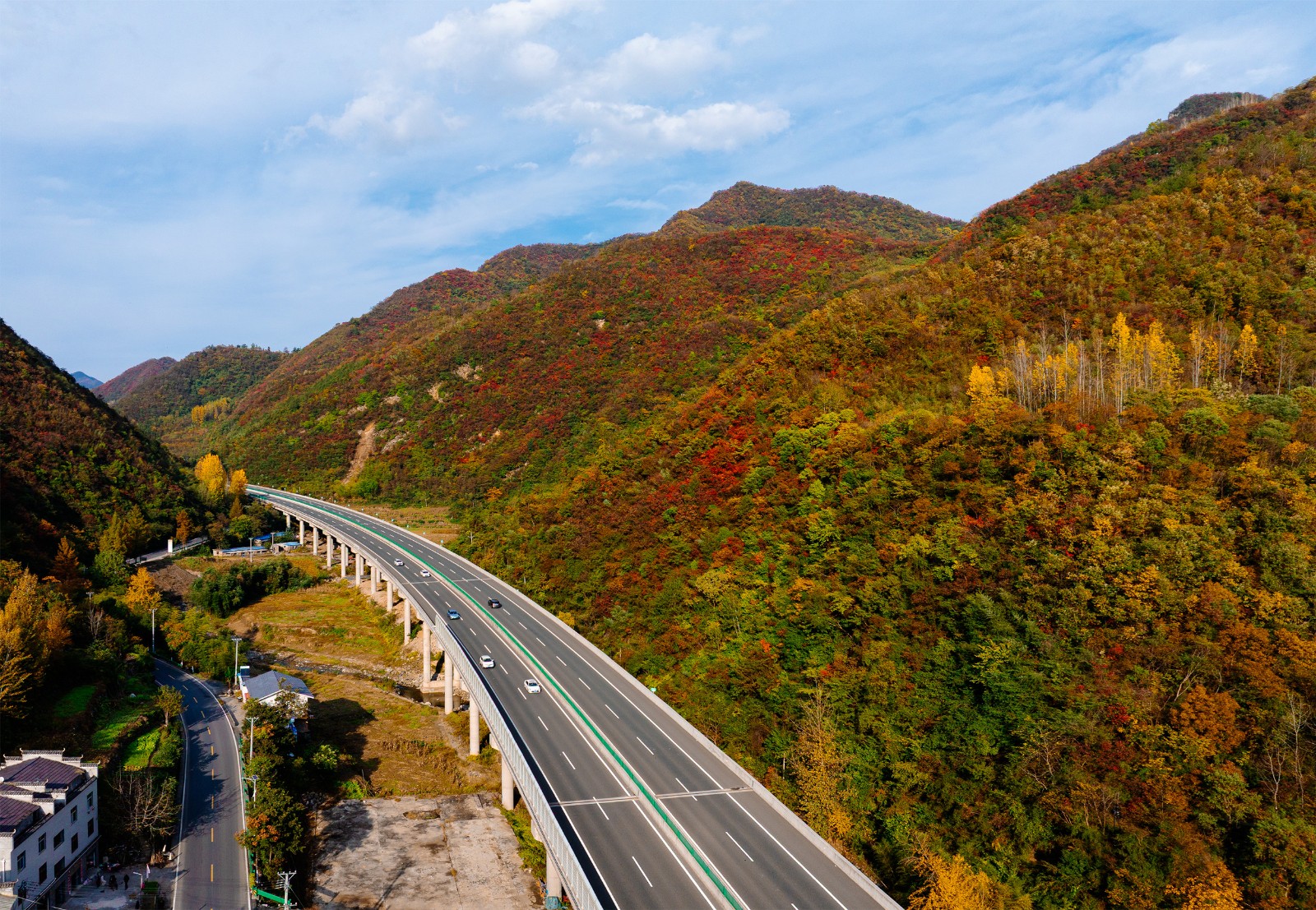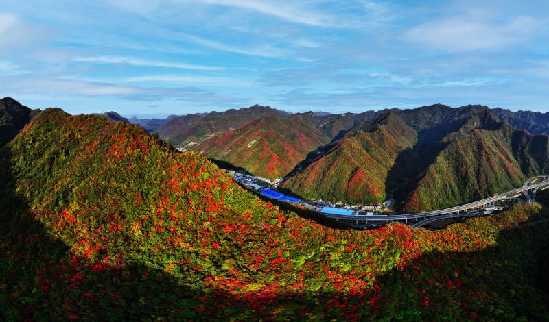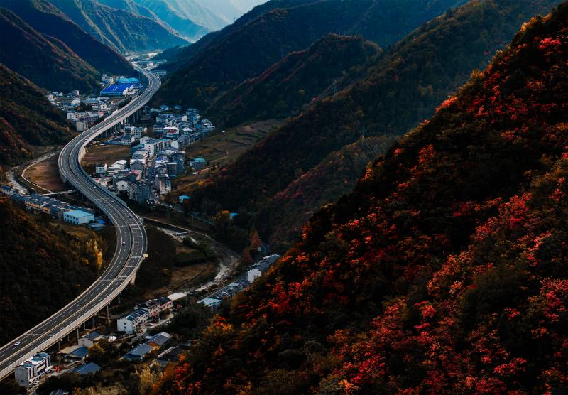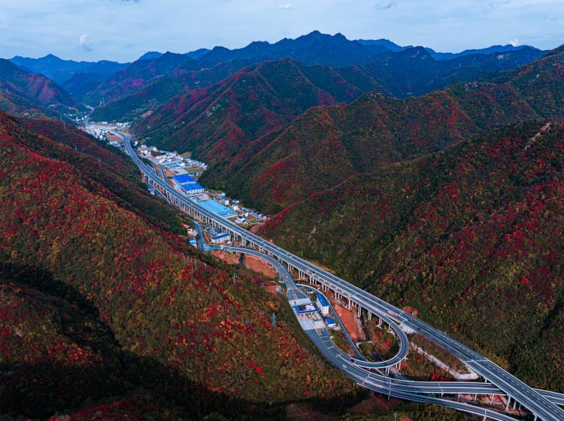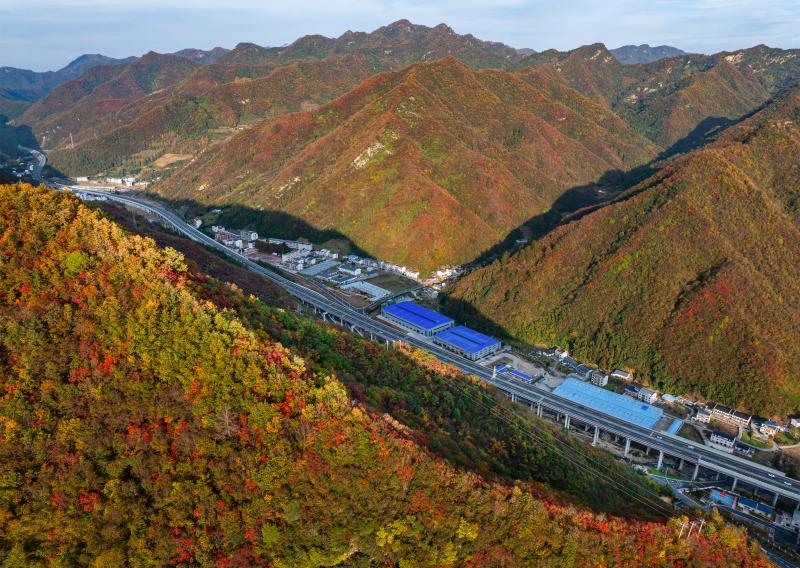 车流如梭,在五彩的秋色中“绘”出“路在景中、景随路延”的生态交通新图景。