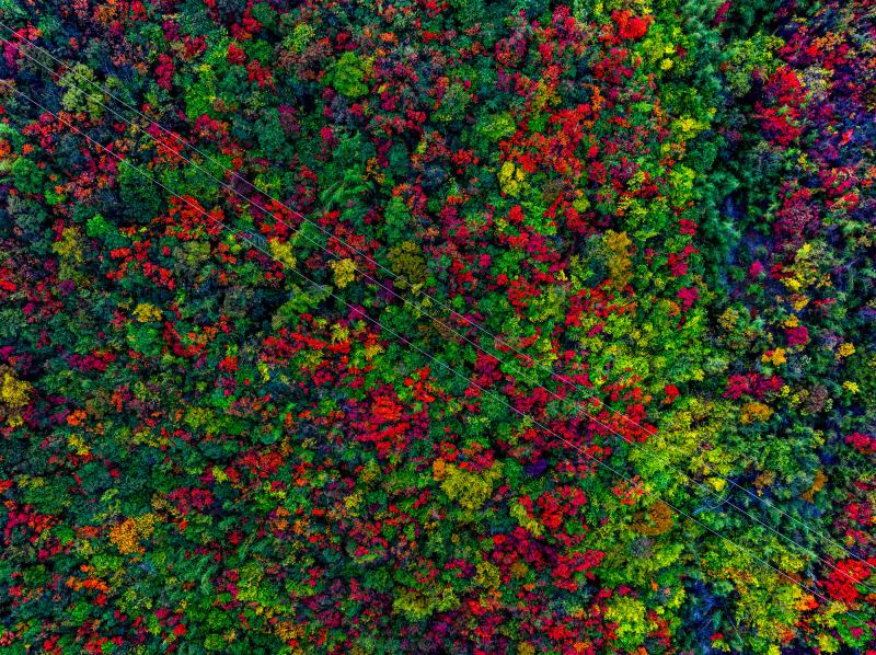 今日竹山网消息 11月2日,双台乡万山丛中,黄栌树、枫树、槭树、黄楝树等落叶树的叶子由绿变黄、变红、变褐,夹杂在常绿树木之间,将山体染成五彩画卷。
