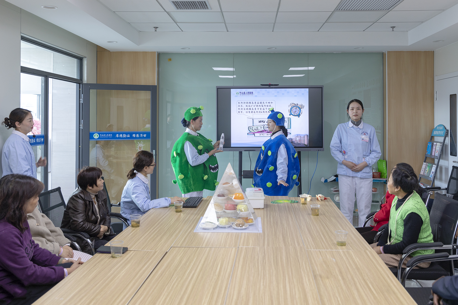 当天下午,医院内科楼12楼的内分泌科宣教室同样暖意融融。健康宣教会一开始,科主任吴蕾就用通俗的语言讲解“三高”自我管理知识,从“怎么吃”“如何动”到“血糖监测小技巧”,现场患者和家属听得非常认真。健康科普小品《小针筒大作用》以生动有趣的方式,向大家展示了正确使用胰岛素针具的重要性,博得了阵阵欢笑与掌声。