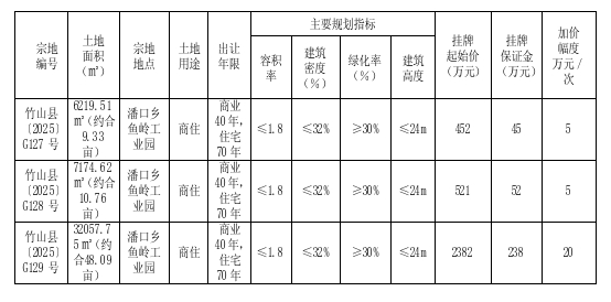 六、本次国有建设用地使用权出让挂牌地点:竹山县公共资源交易中心(竹山县民生路与纵横大道交叉口西北方向100米左右),揭牌时间:2025年12月23日10时00分,地块挂牌时间为:2025年12月9日10时00分至2025年12月23日10时00分。