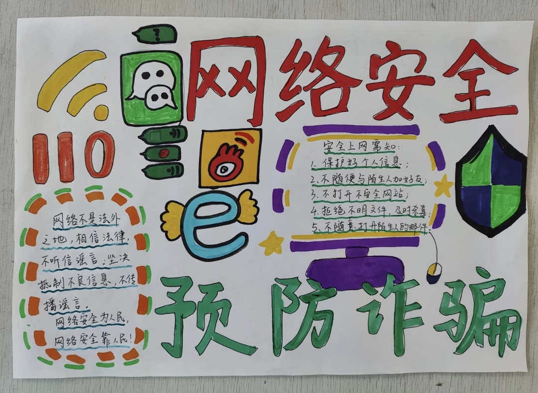 活动期间,学校组织学生制作防诈手抄报、黑板报。学生们发挥创意,以“网络安全 预防诈骗”为主题,将保护个人信息、拒绝不明文件、警惕网络谣言等防诈知识融入作品,如该校学生创作的手抄报,通过醒目的“安全上网需知”条目、生动的网络元素插画,直观展现防诈要点,传递“网络安全为人民,网络安全靠人民”的理念。