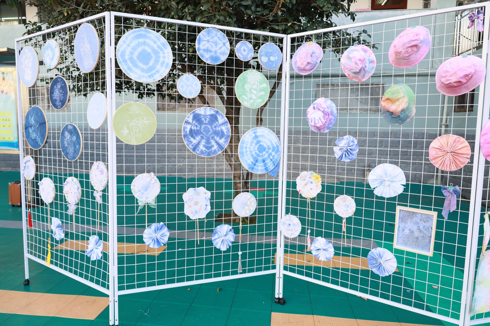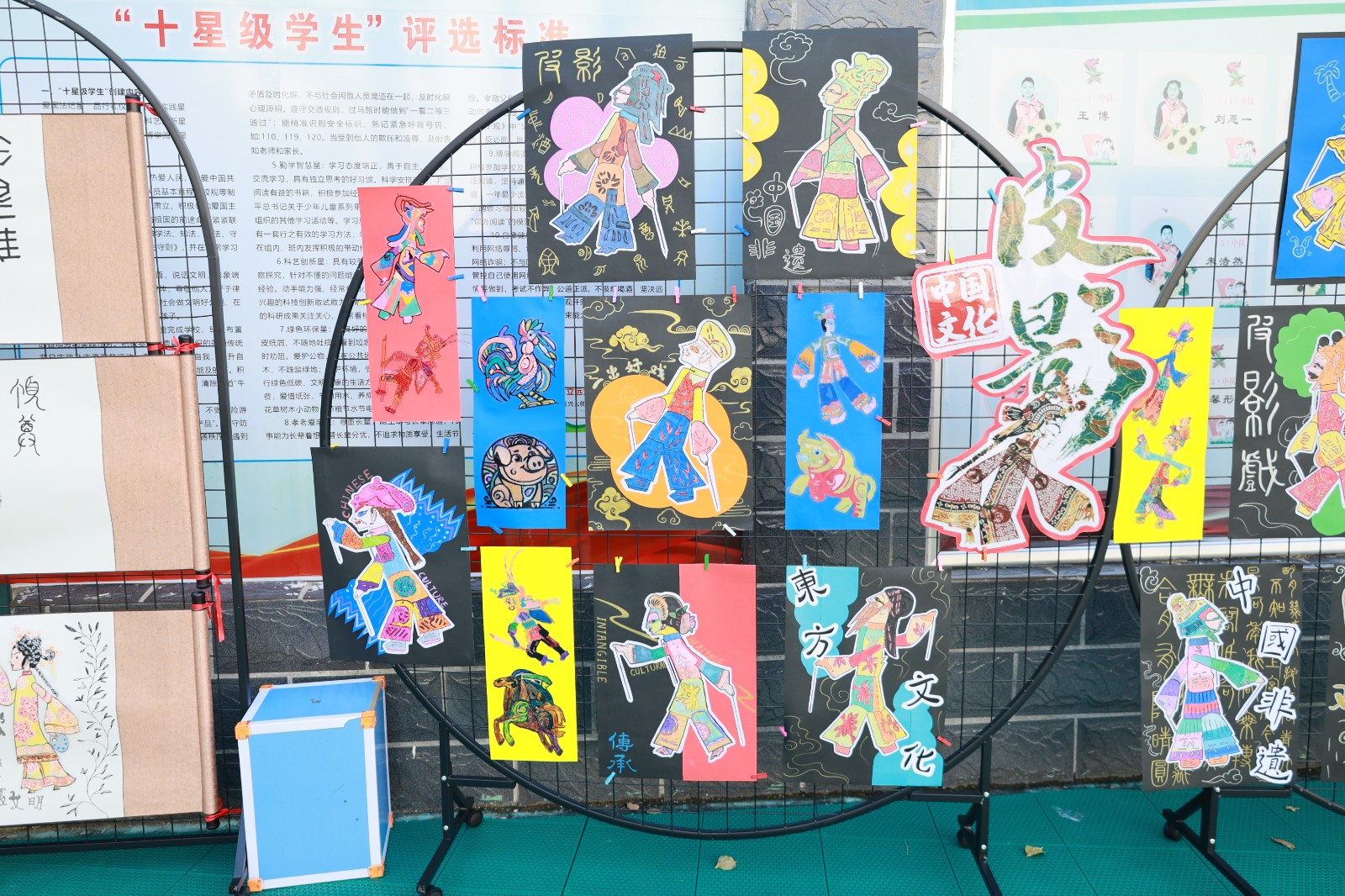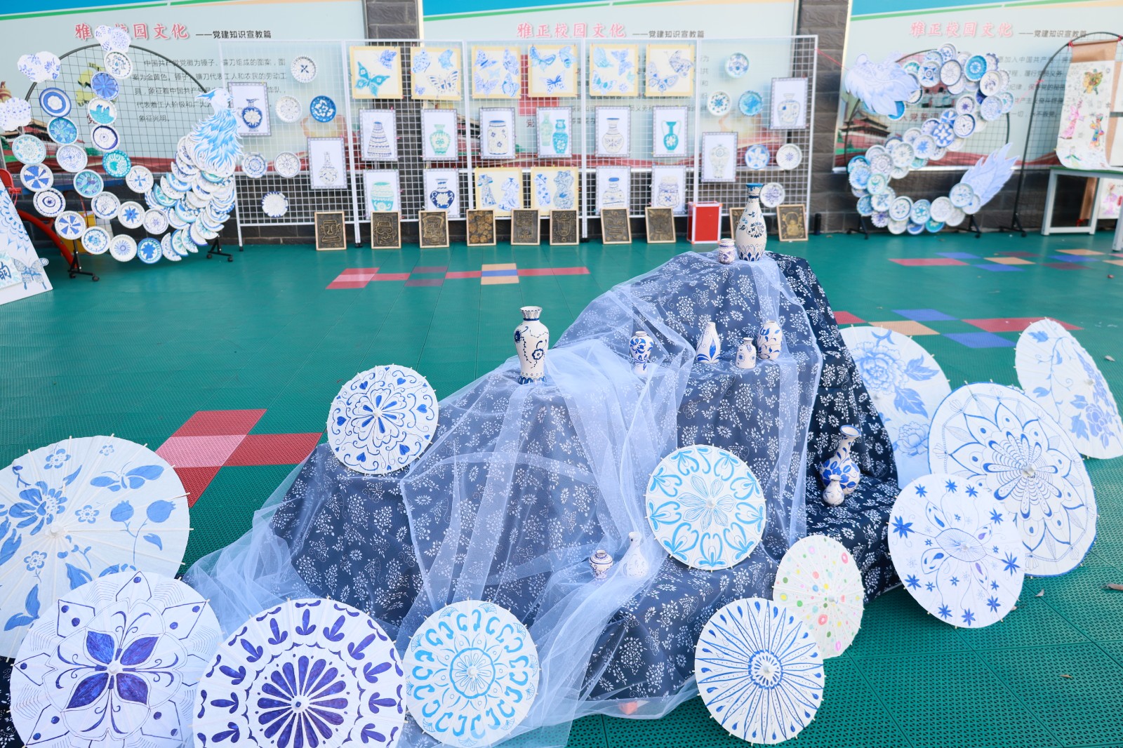 舞台展演活力绽放,《梅花赋》将传统诗词意境与护眼表演动作巧妙融合;《幸运降临花球啦啦操》活力四射的表演点燃全场气氛;戏曲表演《铡美案》,唱腔字正腔圆,身段一招一式有板有眼。静态展览匠心传承,书法展作品,一笔一画间尽显师生对中华传统文化的热爱与传承;剪纸作品精巧别致,花鸟鱼虫、人物故事跃然纸上,惟妙惟肖;色彩绚丽的扎染布料上,蓝白相间的图案充满诗意,每一件都是独一无二的创意之作;传统皮影道具造型生动,孩子们现场演示简单的皮影操作,让观众感受非遗艺术的互动乐趣;青花瓷作品展中,学生们手绘的瓷盘、瓷瓶图案精美,将传统瓷文化与现代审美完美结合。