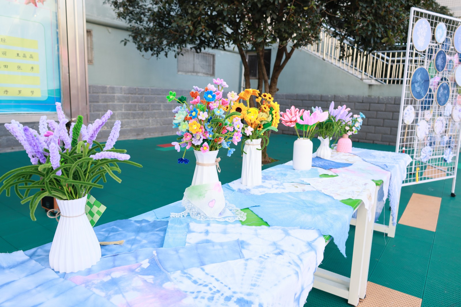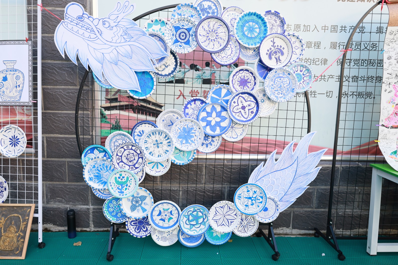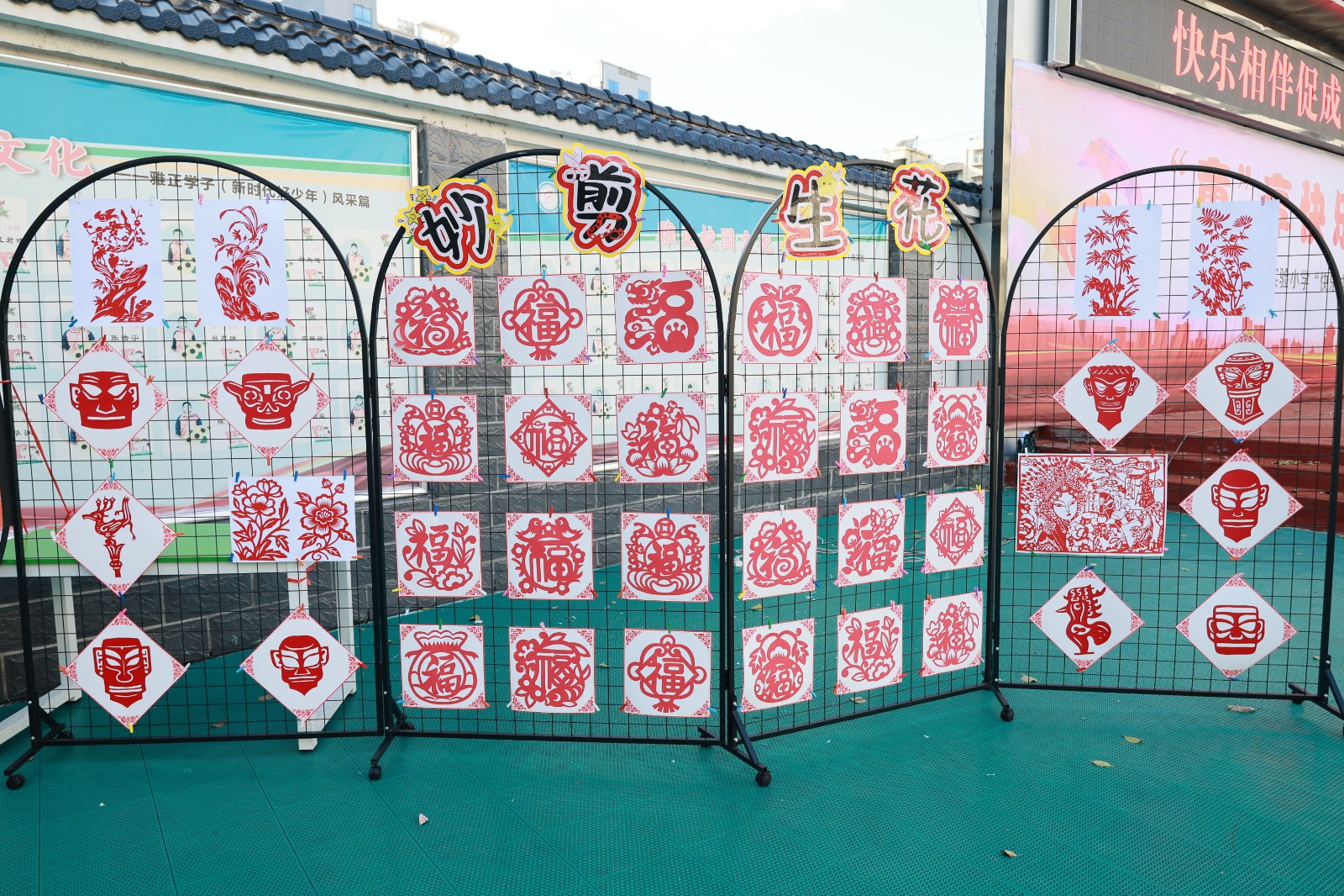 舞台展演活力绽放,《梅花赋》将传统诗词意境与护眼表演动作巧妙融合;《幸运降临花球啦啦操》活力四射的表演点燃全场气氛;戏曲表演《铡美案》,唱腔字正腔圆,身段一招一式有板有眼。静态展览匠心传承,书法展作品,一笔一画间尽显师生对中华传统文化的热爱与传承;剪纸作品精巧别致,花鸟鱼虫、人物故事跃然纸上,惟妙惟肖;色彩绚丽的扎染布料上,蓝白相间的图案充满诗意,每一件都是独一无二的创意之作;传统皮影道具造型生动,孩子们现场演示简单的皮影操作,让观众感受非遗艺术的互动乐趣;青花瓷作品展中,学生们手绘的瓷盘、瓷瓶图案精美,将传统瓷文化与现代审美完美结合。