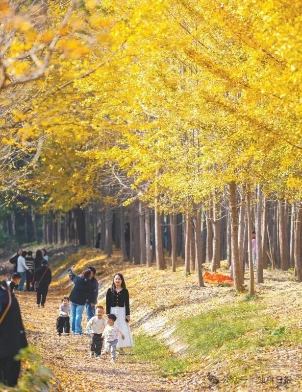 △层林尽染,满目流金,城东桃花岭大道银杏林成为市民郊游的好去处。图为11月15日,市民在银杏林里拍照定格秋日美景。