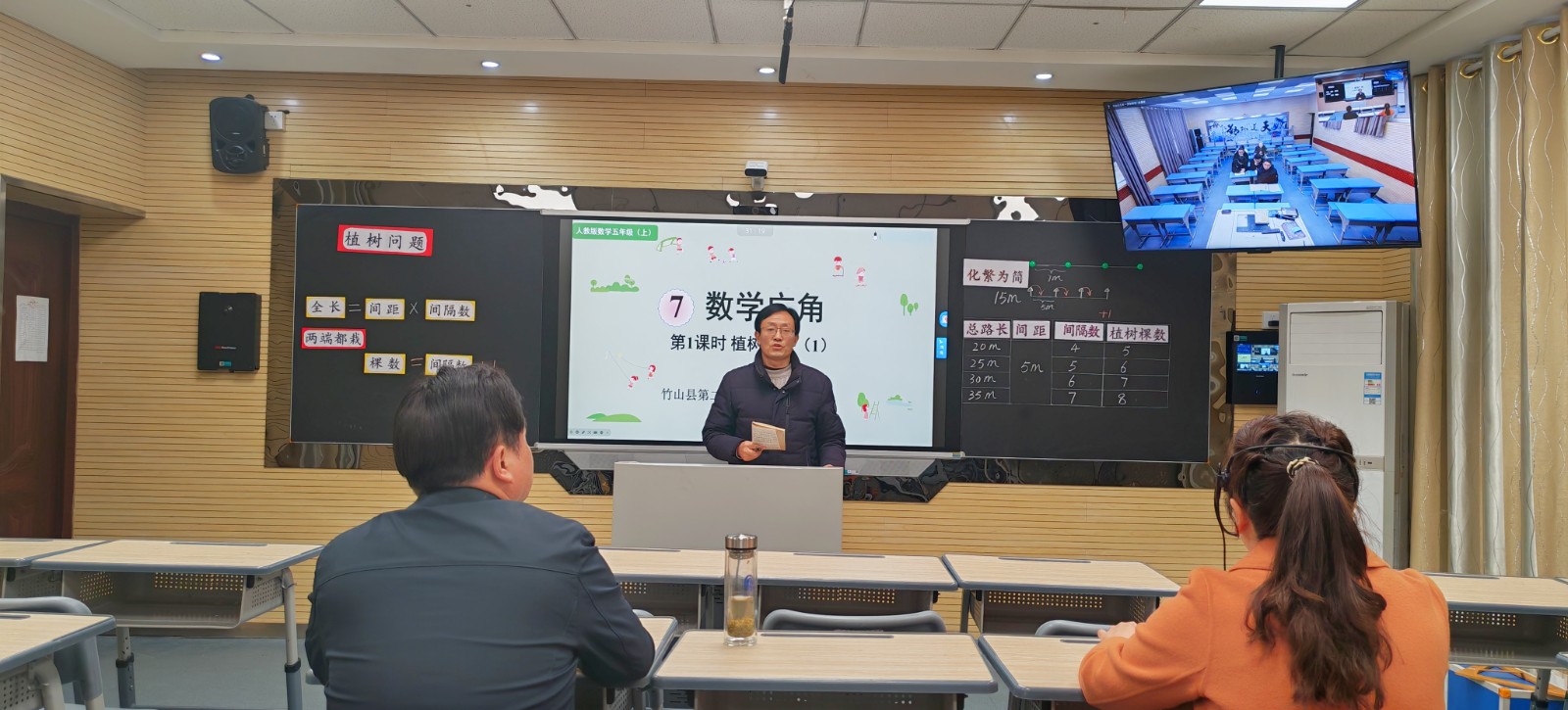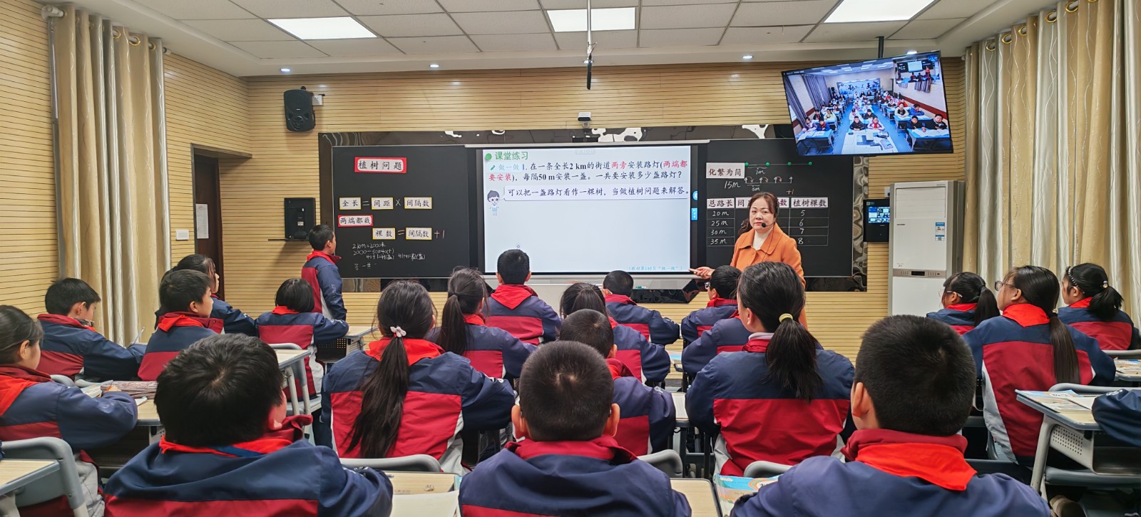 该校市级名师李娟以《植树问题》为题,立足学生认知起点,巧妙创设生活化情境,引导学生通过画图、列表、推理等方式自主探究“植树问题”中的数量关系与规律。借助高清音视频传输与实时互动系统,第二实验小学与双台小学的学生虽相隔数十公里,却能同步思考、同频互动、共同成长,真正实现了“一校授课、多校共享”的教学新模式。