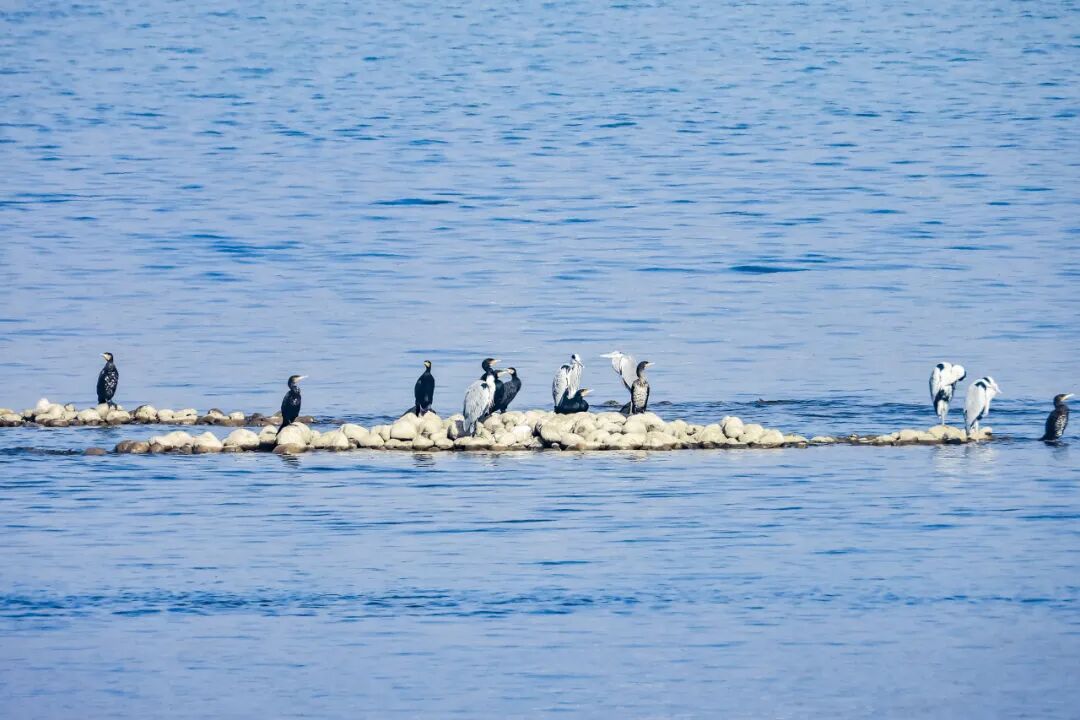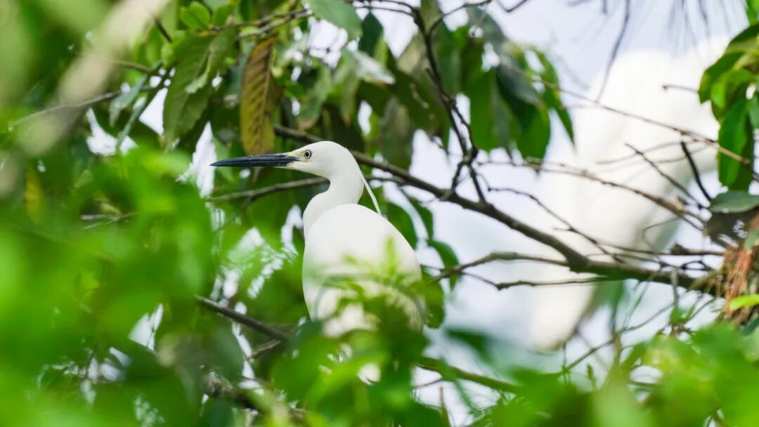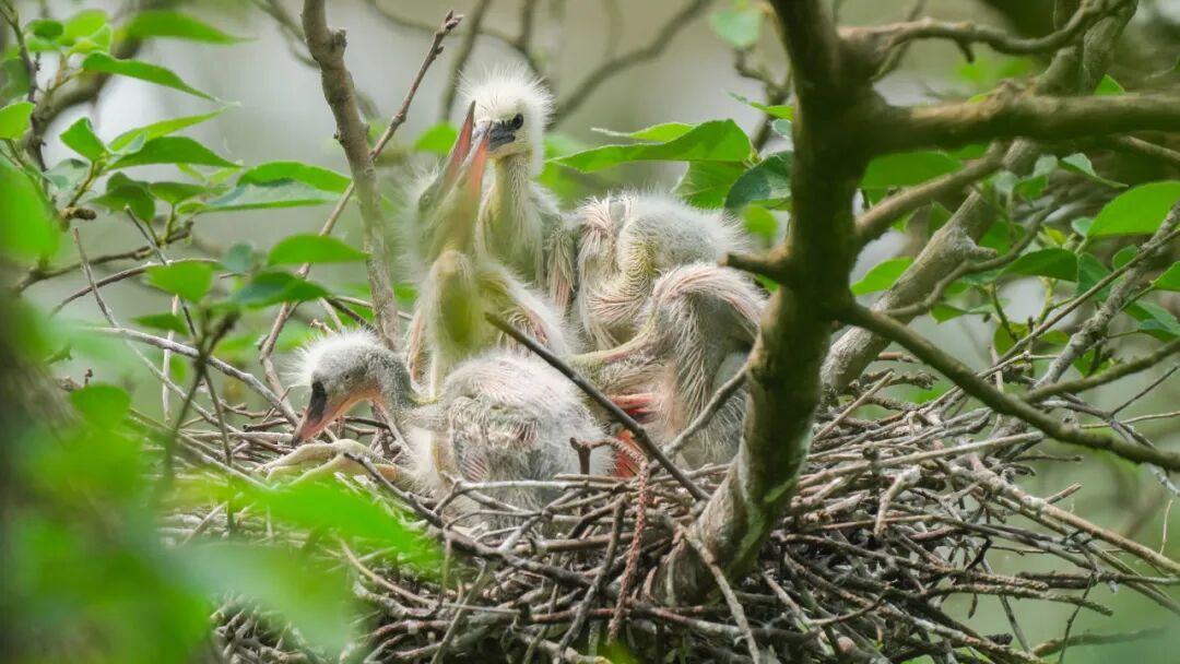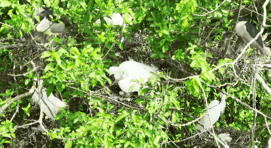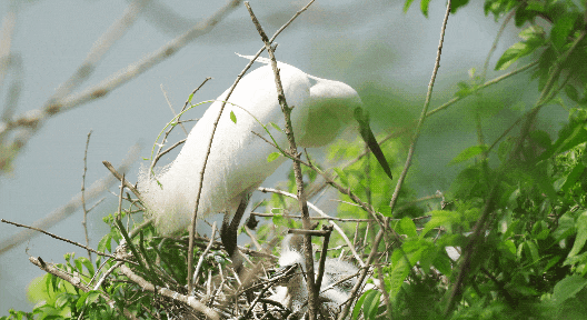 ▲树顶枝桠处鸟巢密布,白鹭宝宝们趴在窝里嗷嗷待哺。
