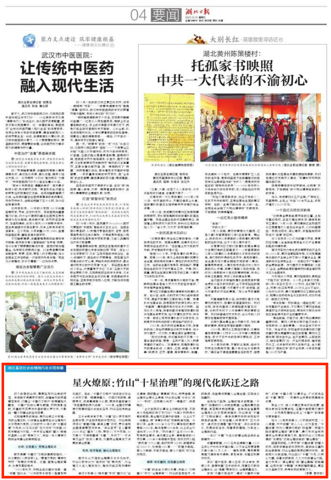 12月10日,湖北日报4版以《星火燎原:竹山“十星治理”的现代化跃迁之路》为题报道了十堰市竹山县“十星级”文明创建。详细报道如下: