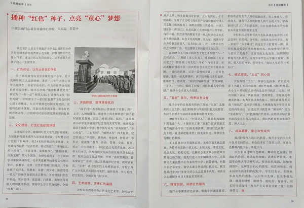 2025年第11期《心系下一代》杂志“基教”栏目以《播种“红色”种子,点亮“童心”梦想》为题,报道了宝丰镇施洋小学红色文化建设取得的丰硕成果。全文从“红色印记,以烈士命名的学校”“文化浸润,打造红色校园环境”“实践体验,缅怀革命先烈”“艺术滋养,传承红色基因”“‘五老’参与,传承红色文化”“课程创新,深耕红色德育”“模式探索,‘五红’润心田”“成效显著,童心向党成长”八个部分进行深度剖析总结。为学校如何用好用活本土红色资源、筑牢立德树人根基提供了极具价值的“样本”。