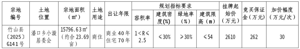 六、本次国有建设用地使用权的挂牌活动于2026年1月21日10时00分在竹山县公共资源交易中心(竹山县民生路与纵横大道交叉口西北方向100米左右)进行;地块挂牌时间为2026年1月7日09时00分至2026年1月21日10时00分。