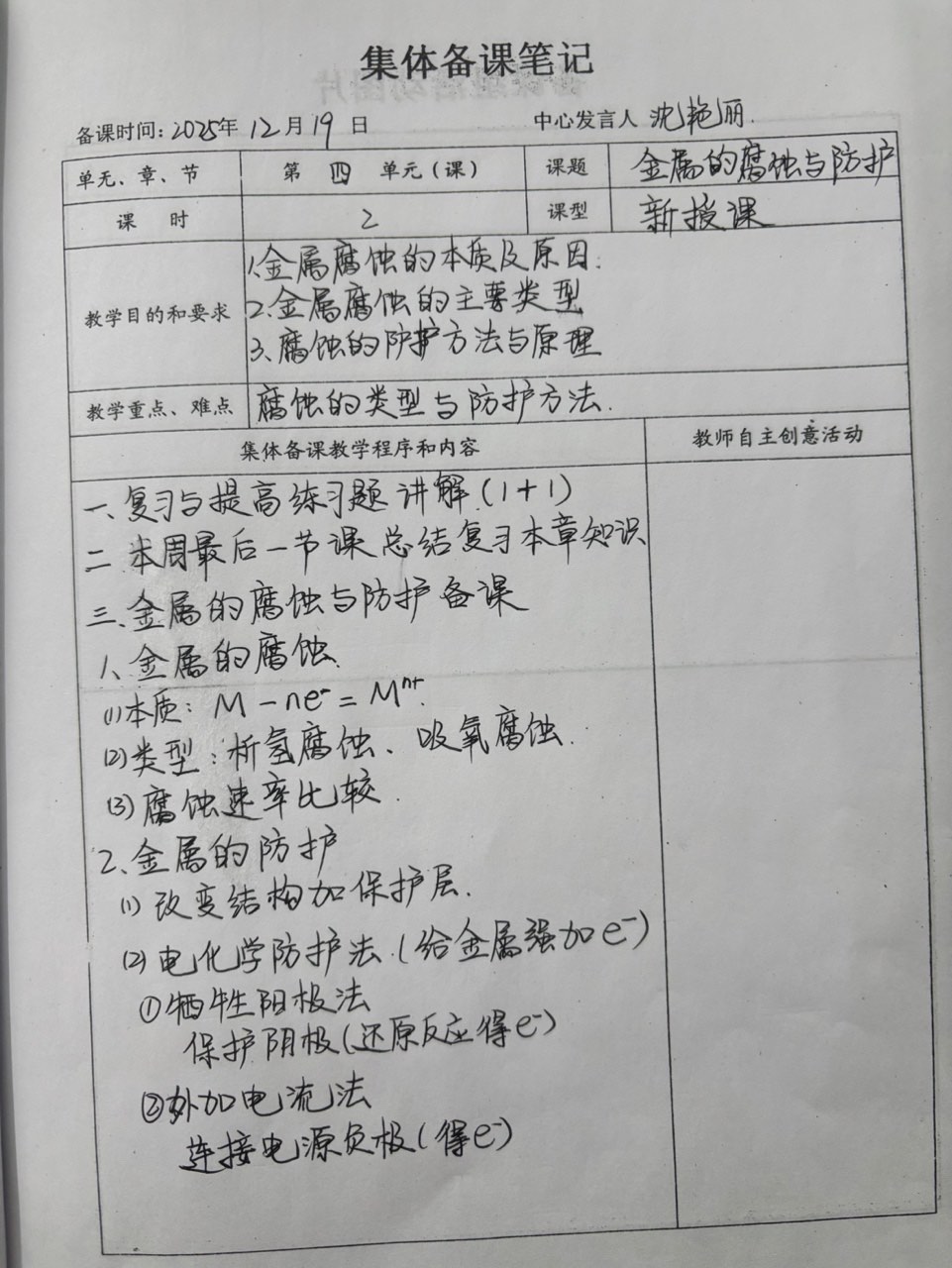 高二教师们以月考备考为重点,对阶段教学安排进行深入研讨。围绕《金属的腐蚀与防护》这一课题,教师们融入实验设计与生活实例,优化教学设计,从腐蚀原理到防护应用,既注重理论逻辑的串联,又强化实验操作的规范。通过构建思维导图、归类典型错题等方式,帮助学生突破“电化学”知识难点。研讨制定阶段复习计划和分层提升方案,推动备考工作扎实有序、高效开展。