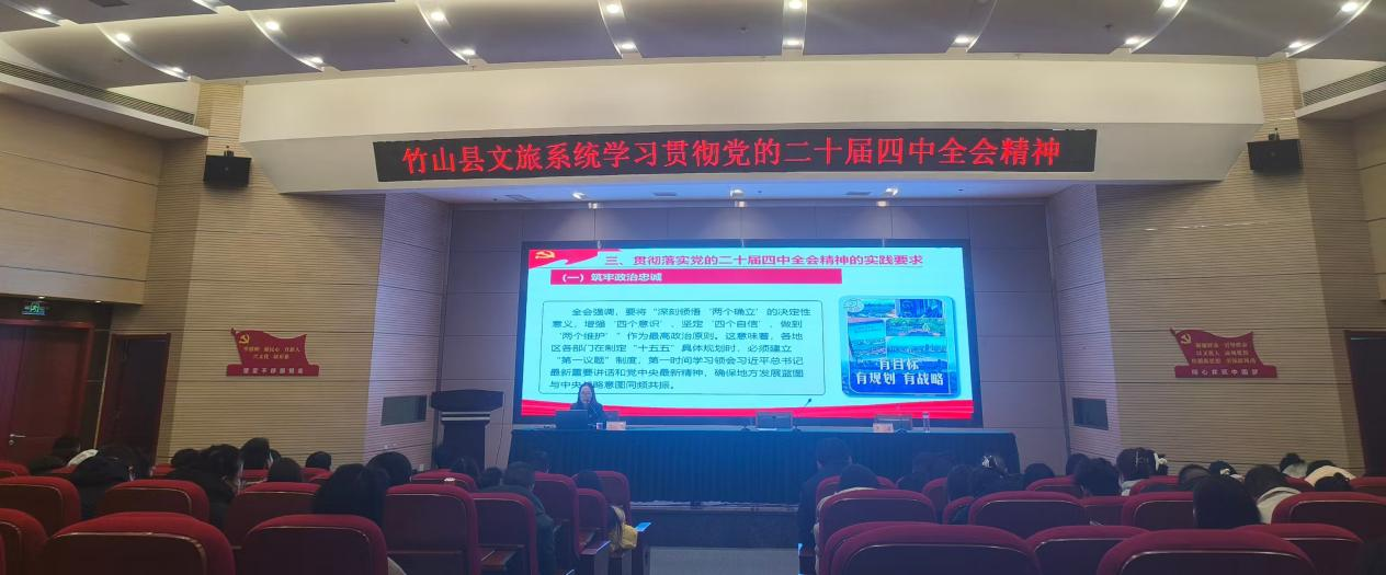 今日竹山网消息 12月19日,县委党校教师梁晓以“勇担时代使命奋力开创中国式现代化新局面”为主题,在秦巴艺术中心面向县文化和旅游局全体干部就学习贯彻党的二十届四中全会精神进行宣讲。