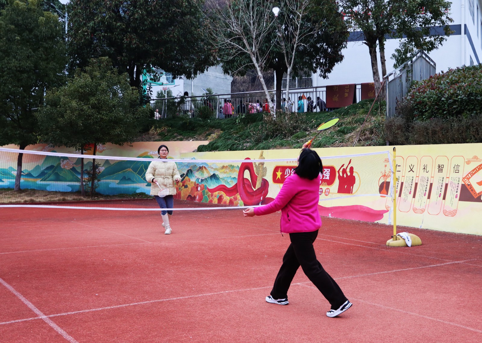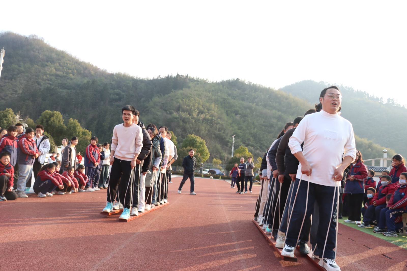 本次运动会设置了8人大脚板、6人毛毛虫、拔河、接力赛、乒乓球、羽毛球等多个趣味与竞技兼具的项目。赛场上,教职工们热情高涨:“8人大脚板”项目中,队员们脚绑木板、手挽绳索,步伐整齐划一,展现出高度的团队协作精神;拔河比赛中,双方队员紧握绳索、奋力拼搏,加油声此起彼伏;接力赛的跑道上,选手们如离弦之箭,传递着速度与激情;羽毛球、乒乓球赛场则充满技巧与智慧的较量。场边的学生们组成啦啦队,为老师们呐喊助威,校园内洋溢着欢乐与团结的气息。