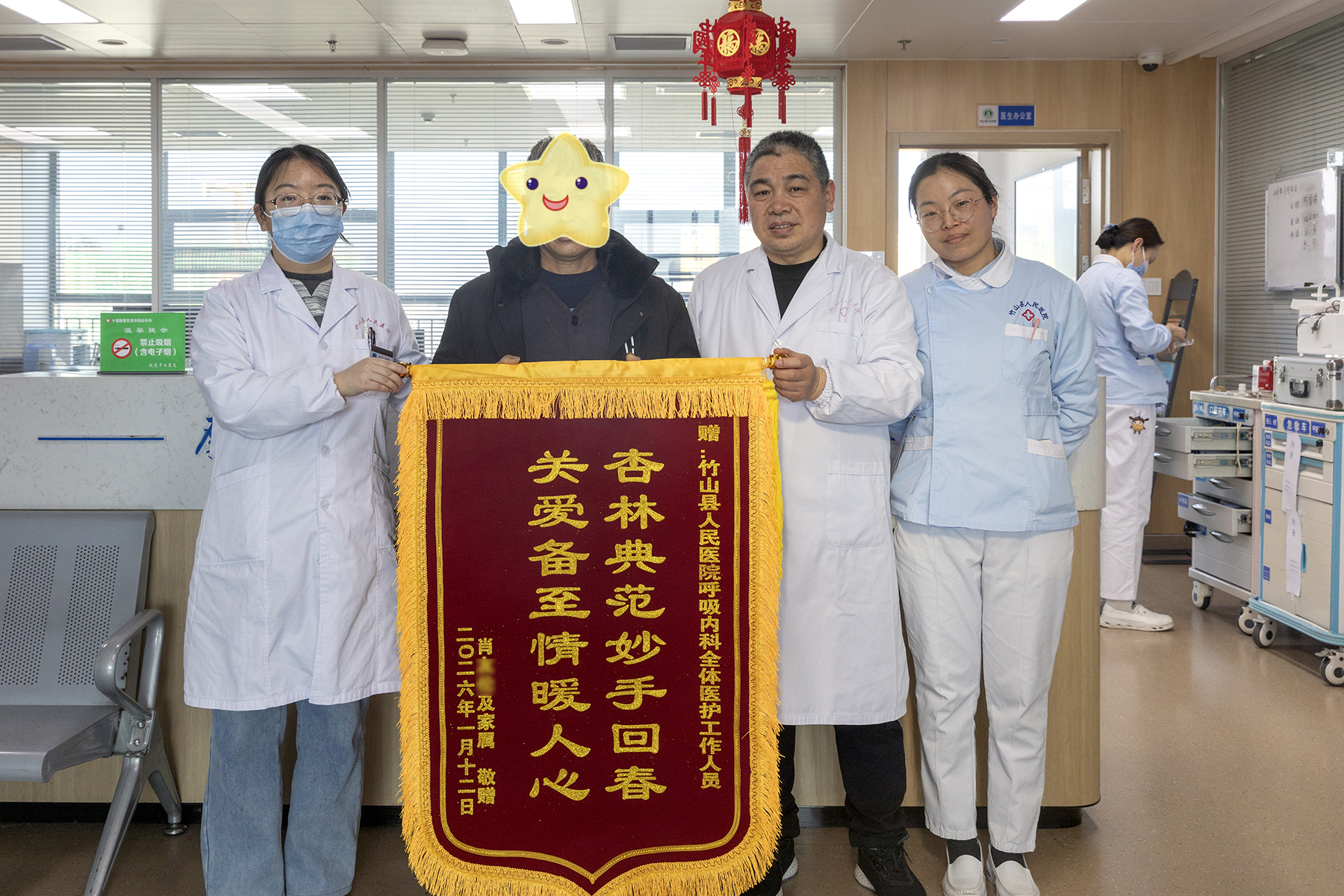 今日竹山网消息 1月12日午后,阳光裹着暖意漫进竹山县人民医院呼吸内科护士站,即将出院的肖先生,双手将一面烫金锦旗递到医护人员手中,红底黄字的“杏林典范妙手回春,关爱备至情暖人心”,在病区里格外醒目。