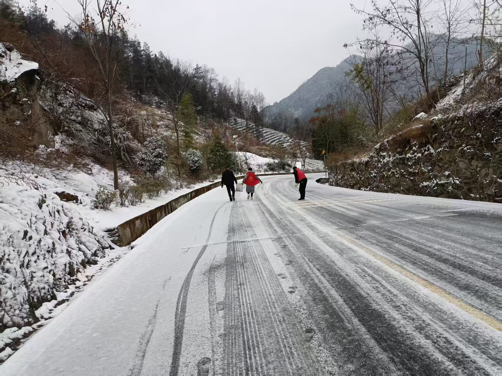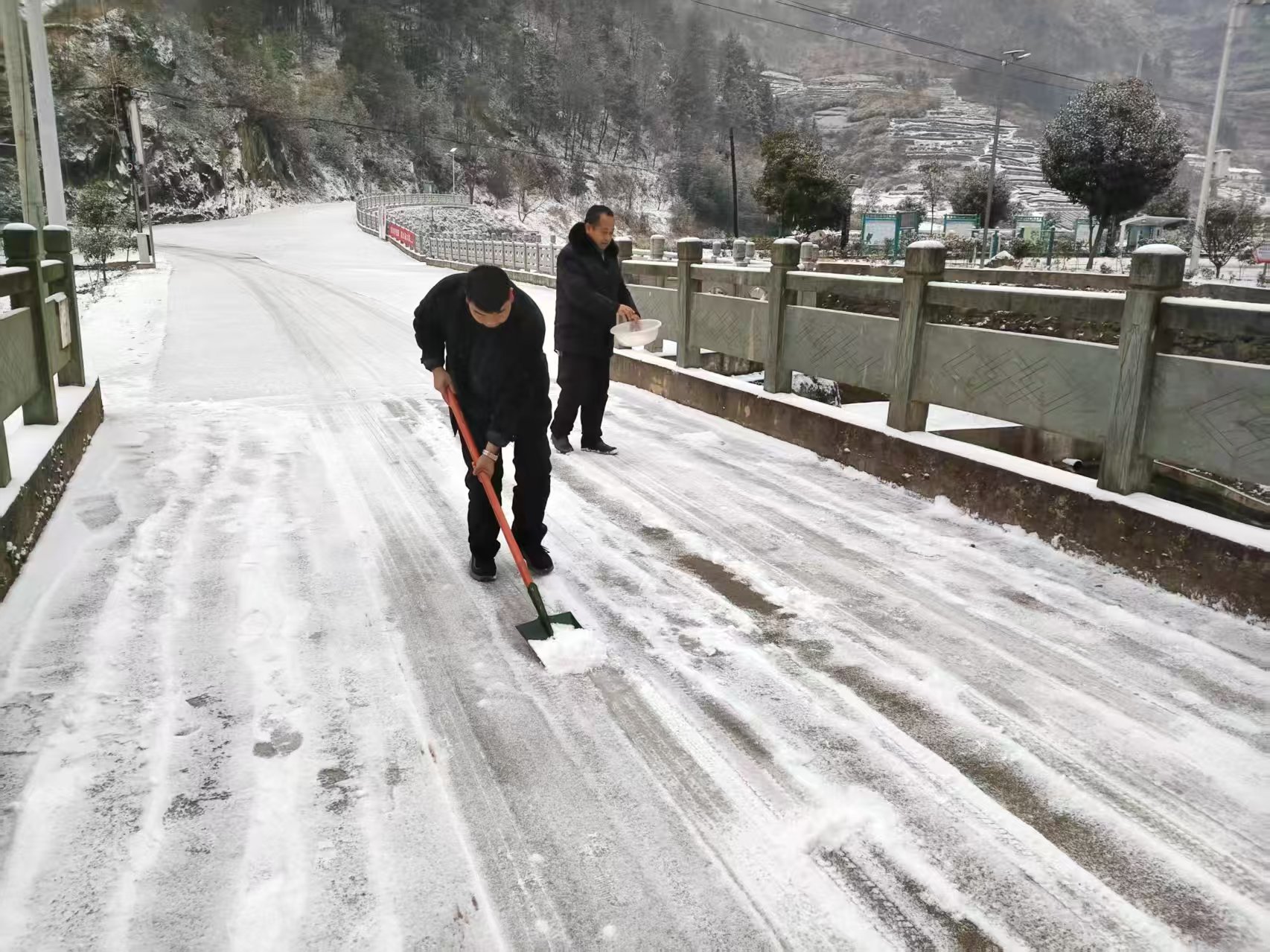 20日清晨,工作人员携带工具,前往主干道、乡村道路、陡坡弯道及学校周边等重点区域清除积冰。在结冰严重路段,有人铲除路面冰层,有人撒布融雪盐,并对过往车辆和行人进行安全劝导,提醒减速慢行。