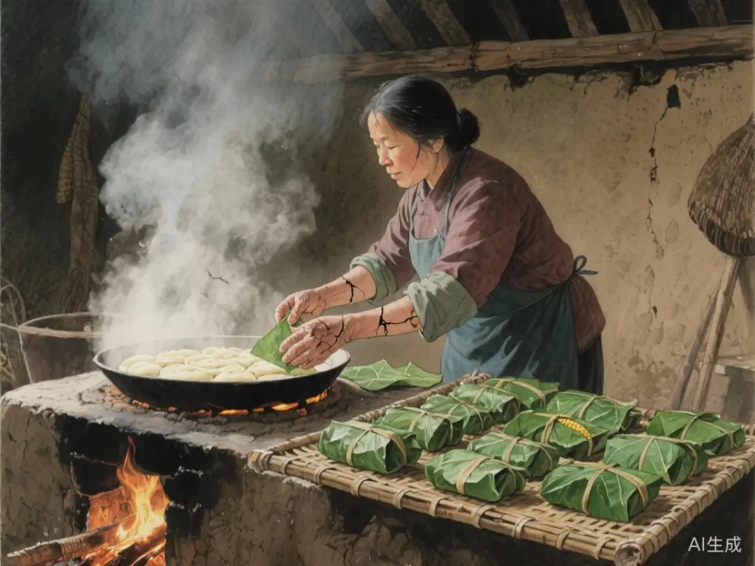 老家唤它“浆粑馍”,三字朴素如土,却盛满了童年最熨帖心窝的滋味。各地做法不一,有摊饼煎烙者,也有单蒸浆糊者。但母亲独创其法:将新鲜磨制的苞谷浆与南瓜丝、韭菜段或萝卜缨为馅,裹入经沸水烫软的桐子叶中,对折捏合,形如月牙,再贴于铁锅四壁,借煮饭余温蒸熟。一锅两用,是对柴火最精明的算计,也是生活重压下开出的智慧之花。